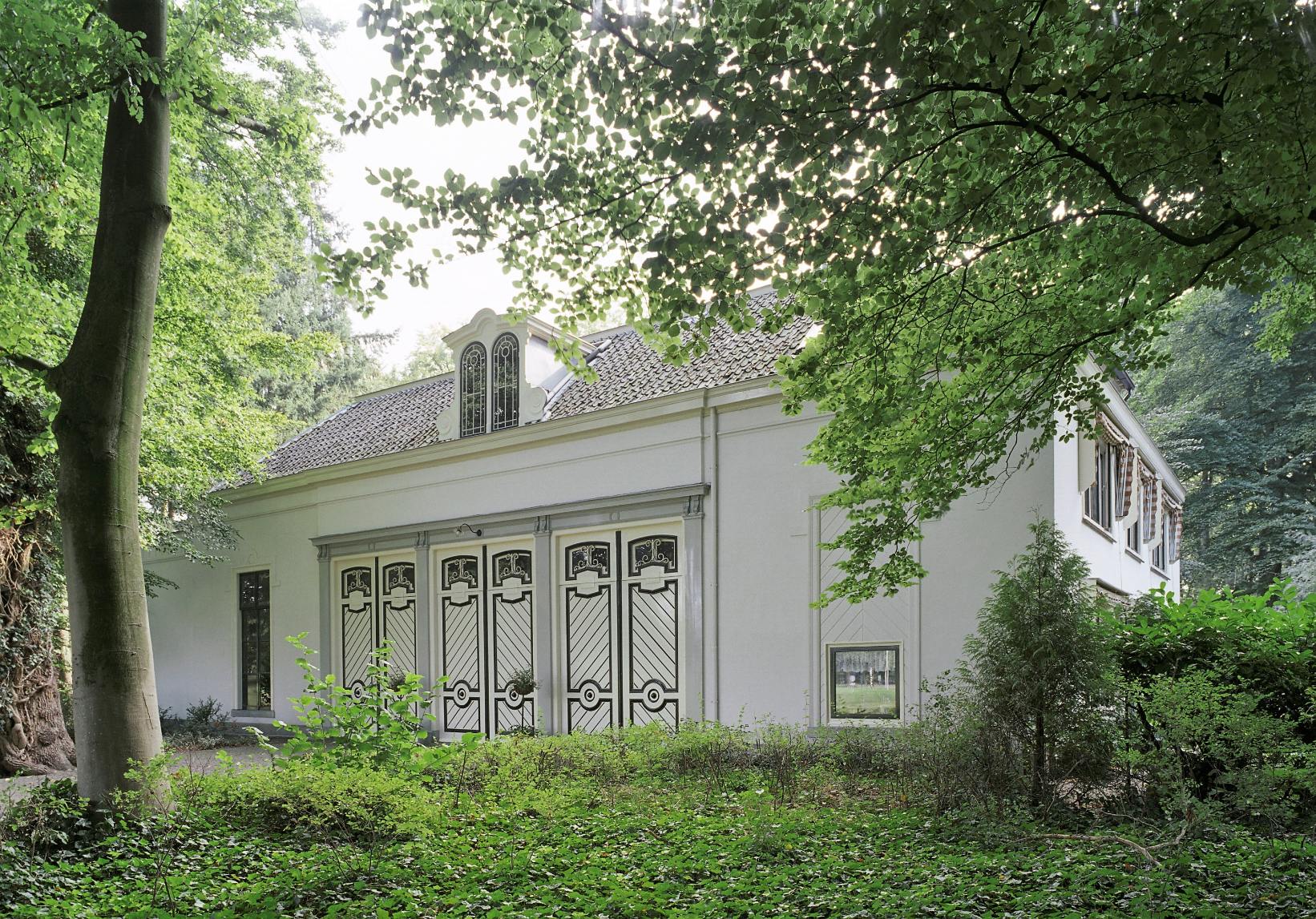 Het koetshuis van de buitenzijde, met drie uitrijpoorten groot genoeg