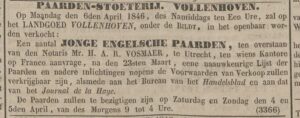 “Als eene bijdrage tot de paardenfokkerij, meenen wij niet onvermeld te mogen laten, de belangrijke stoeterij van den Baron van der Capellen van Berkenwoude, Lid dezer vergadering, op het landgoed Vollenhoven onder de gemeente de Bilt, alwaar met een gewenscht gevolg de paardenfokkerij wordt uitgeoefend van inlandsch en vreemd ras. Gedurende den laatsten dektijd zijn er ter verdere voortzetting dezer paardenfokkerij aldaar, ten gerieve van degenen, die zulks verlangden, twee Engelsche volbloedhengsten uit ’s Konings stoeterij te Borculo geplaatst”, aldus de Utrechtsche Provinciale Courant op 1 november 1843. Die twee hengsten maakten zich zo verdienstelijk dat in de jaren die volgen verkopingen van hun nazaten en van drie- en vierjarige volbloeden op Vollenhoven plaatsvonden.