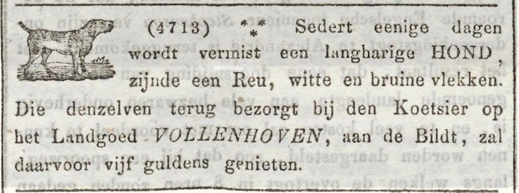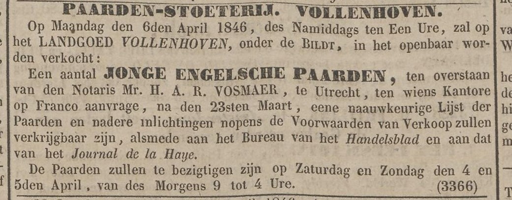 “Op maandag 20 mei, voormiddags ten tien ure, zal op het Landgoed Vollenhoven, onder de Bildt, in het openbaar en om kontant geld, worden verkocht: een aantal jonge Engelsche paarden, ten overstaan van den notaris Mr. H.A.R. Vosmaer, te Utrecht, ten wiens kantore, op franco aanvrage, eene naauwkeurige lijst der paarden en nadere inlichtingen nopens de voorwaarden van verkoop zullen verkrijgbaar zijn”, volgens een aankondiging in het Algemeen Handelsblad op 8 mei 1844. Een bekende volbloed die op Vollenhoven het levenslicht zag ‘getrokken uit een hengst van de koninklijke stoeterij’ was Pastille, aangekocht door de Velser Sociëteit en doorverkocht aan de heer Seidler, die de bruine ruin eind jaren 1840 ’s zomers uitbracht op de renbanen en ’s winters in conditie liet houden als rijpaard in de manege te Utrecht.