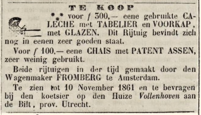 Van der Capellen zelf maakte echter frequent buitenlandse reizen en had daarbij een status die het reizen met de publieke diligence oversteeg. Het kan niet anders of er zijn op Vollenhoven en in de hofstad één of meerdere zware reisrijtuigen geweest, beladen met koffers en bij slecht weer te sluiten; rijtuigen die na de komst van de stoomtrein overbodig raakten. Mogelijk is zo’n ouderwets reisrijtuig op Vollenhoven blijven staan na het overlijden van Van der Capellen: in november 1861 had de koetsier er te verkopen een gebruikte calèche ‘met tabelier en voorkap, met glazen’ voor driehonderd gulden, een spotprijsje. Naast die reiscalèche verkocht de koetsier een chais op patentassen voor honderd gulden: een lichte tweewieler waarmee de eigenaar met of zonder koetsier met een behoorlijke snelheid een dagreis kon maken. Beide rijtuigen waren ‘in der tijd’ gemaakt door de Amsterdamse wagenmaker Fromberg; dat moet dan voor 1848 zijn geweest, wanneer Peter Fromberg naar Indië vertrekt.
