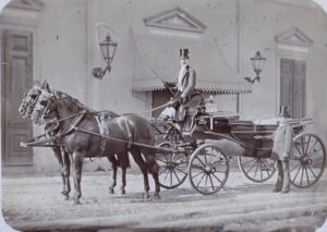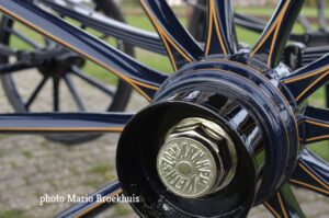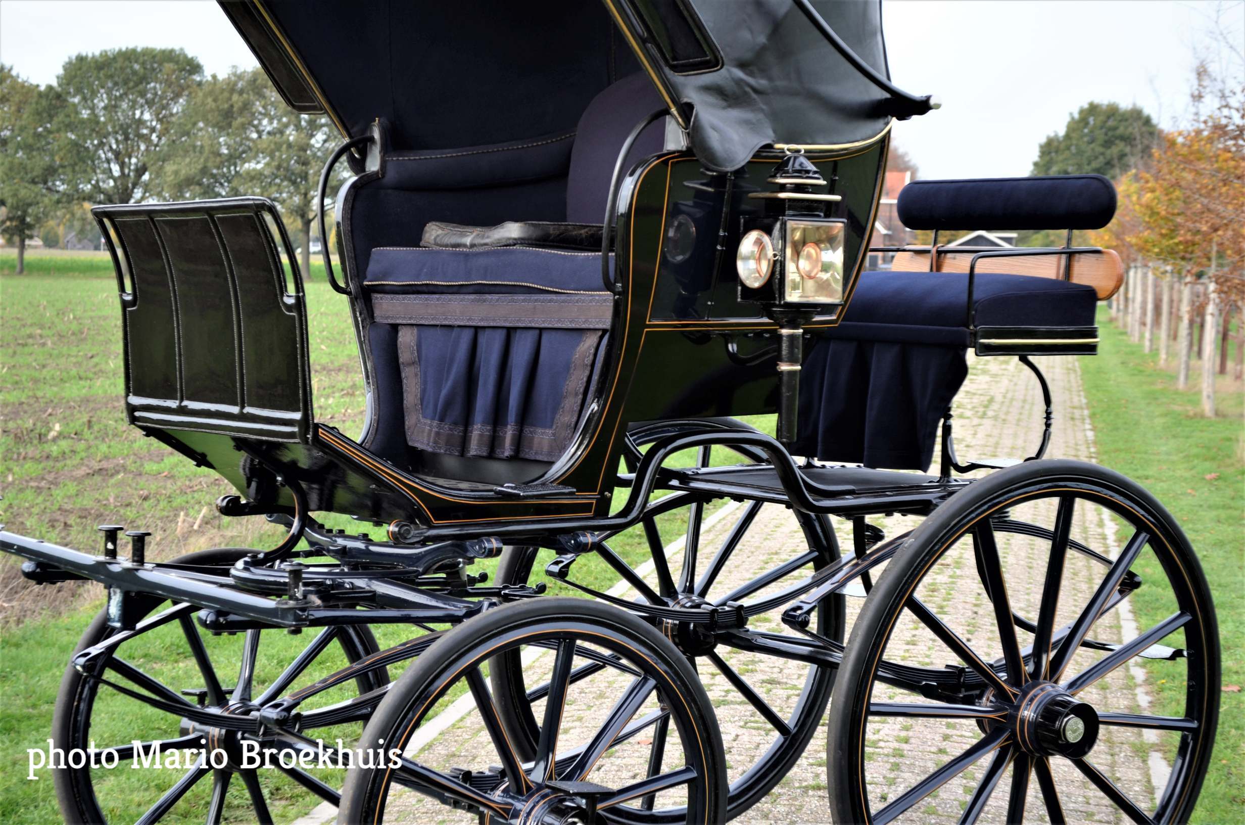 Vijftig jaar terug in de tijd lukt dus wel, puur uit overlevering, maar grote hamvraag is, waar komt zo’n rijtuig oorspronkelijk vandaan? Een belangrijke, recente ontdekking zijn de foto’s in de Revue der Sporten, uit 1909 en 1910. Daarop zien we dat het om een volledig identiek exemplaar gaat. Er zijn een paar omstandigheden die meetellen bij het beantwoorden van de vraag ‘is dit ‘m’? Feit is dat de bouwperiode na 1900 moet liggen, toen Bastiaan Veth zijn zoon in de zaak betrok, want die combinatie staat op de wieldoppen en in de ‘neuzen’ van de lampen gegrafeerd. Het model is bovendien vrij modern. In de periode na 1900 stapten sportievelingen eerder over op een automobiel, dan dat ze een sportrijtuig als een spider-phaeton (ook wel ‘napoleon’ genoemd) nieuw lieten bouwen. Seriematig werden ze niet gemaakt. Alleen op de concoursen hippique groeide een nieuwe behoefte aan showrijtuigen zoals deze, maar het bleef een selecte markt.