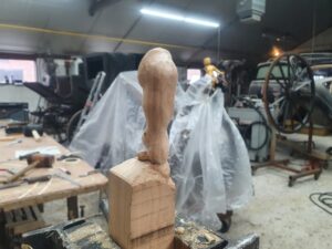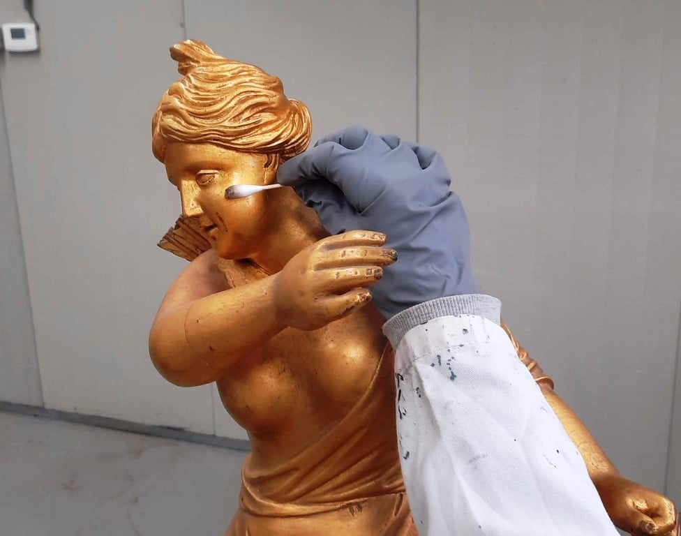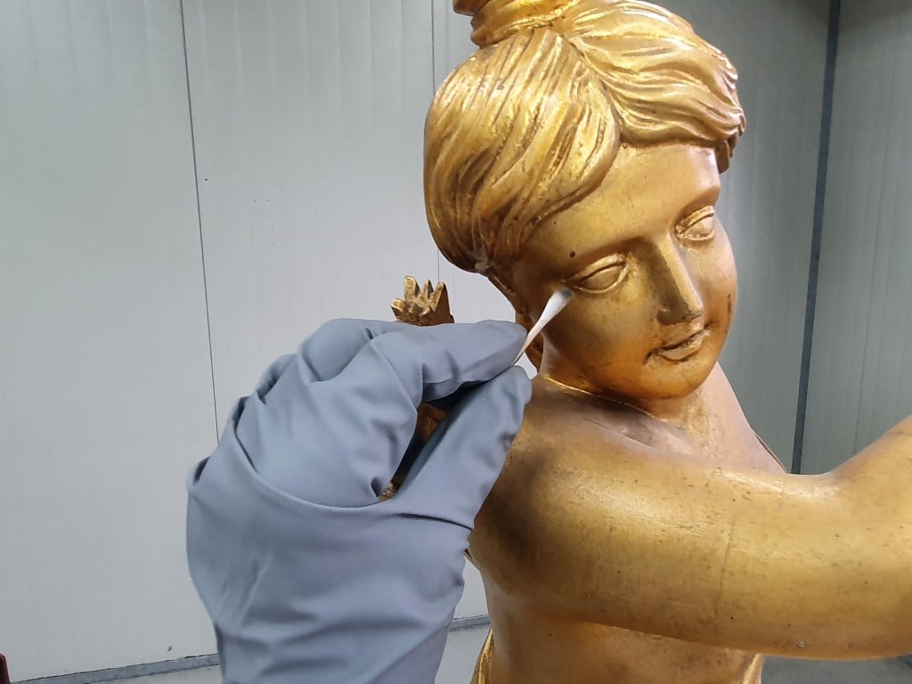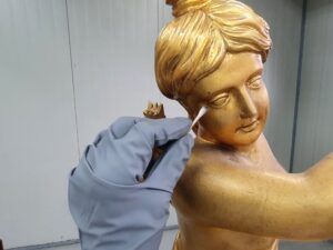 Maar deze was een been, een arm en zijn jachthoorntje kwijtgeraakt. In het restauratieatelier Stolk was nog een voorraadje iepenhout van de beroemde wagenmaker Jan van Peet (die van de Grolsch-reclame ‘Vakmanschap is Meesterschap’) en uit dit hout zijn nieuwe onderdelen gesneden. Het gebeurt zodanig dat bezoekers van Slot Zuylen het verschil aan het beeld straks niet meer zien, tenzij je serieus onderzoek gaat doen, dan kun je het ontdekken, want we willen toekomstige generaties niet neppen. Verder is het bladgoud van Diana schoongemaakt: ze schijnt weer. Alleen is ze in het verleden haar boog verloren en dat is de volgende uitdaging….