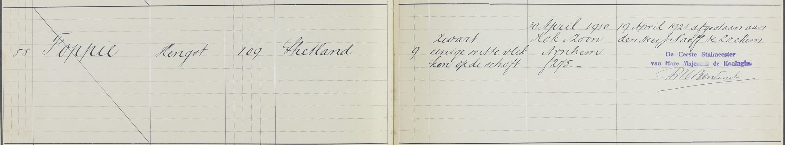 De shetlandpony die was voorbestemd voor de eerste paardrijlessen van het kind, kwam eerder op zaterdagmiddag 16 april 1910 per spoor aan in Apeldoorn. In het stalregister staat hij vermeld als ‘Foppie’, als negenjarige hengst, 1,09 meter schofthoogte, voor 275 gulden gekocht bij Kok & Zoon in Arnhem.