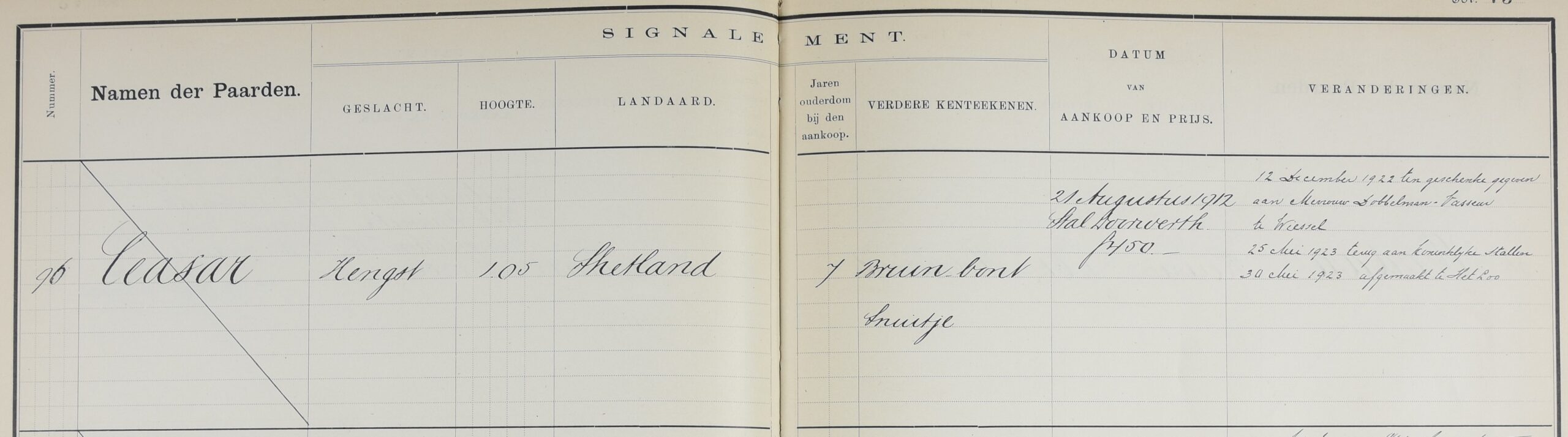 Twee maand later schrijft de Nieuwe Courant dat Stal Doorwerth, de handelsstal van baron Anton van Brakell, een shetlander heeft verkocht aan koningin Wilhelmina voor haar dochter. Het is de hengst Caesar, 1,05 meter hoog, zeven jaar oud en bruinbont van kleur. De majesteit betaalt er 450 gulden voor en die investering loont, want de pony is braaf en voorwaarts. Prinses Juliana laat zich met de bonte Caesar vereeuwigen, al is het niet zo enthousiast als haar moeder eertijds met Baby op de foto ging: wanneer in 1920 een einde komt aan de verplichte paardrijlessen, stopt Juliana er subiet mee, want paardrijden is niet bepaald haar hobby.