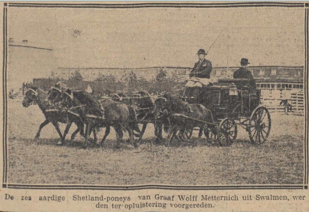 Graaf Wolff Metternich stuurt zijn koetsier naar het concours ter promotie. Zo laat hij in 1929 een zesspan zien op het concours hippique in Den Haag, en ook in Zelhem geven de shetlanders van de graaf acte de presence: “Wij zagen een zesspan gereden door den Gestütsdirector Herrn Bongardt, een tweespan door Grafin Metternich en een eenspan door Comtesse Gilla Metternich, waarmede zeer veel succes werd geoogst. Tijdens het concours hadden wij een onderhoud met den heer Bongardt en vernamen met belangstelling van de prestaties waartoe deze kleine ponies in staat zijn; b.v. 1000 kilo wordt door zoo’n pony gemakkelijk op den weg, ook kleine heuvels op en af getrokken. Dat ook lange afstanden geen bezwaar voor hen opleveren blijkt uit het feit, dat de heer Bongardt er geregeld mede naar huis (Duitschland) rijdt en dan met een span de plm. 70 km in 3,5 uur aflegt. En dan te weten, dat deze ponies nimmer krachtvoeder krijgen en alles doen op gras of hooi, bewijst wel, dat zij voor weinig kosten zijn te onderhouden en zeer sterk zijn.” (Paard en Paardenwereld 26-9-1929).