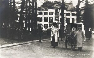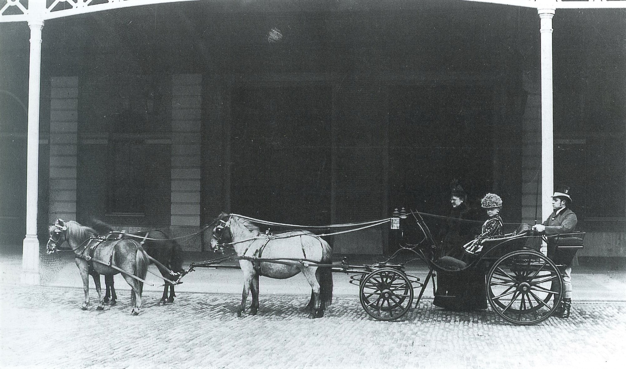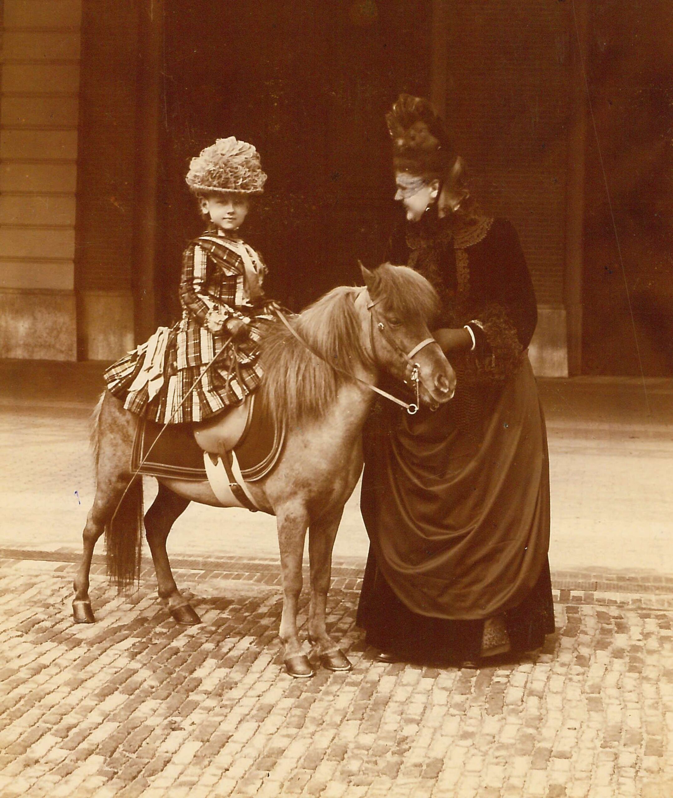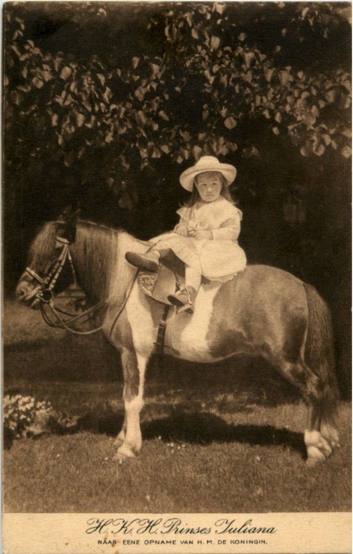 In 1910 schenkt koningin Wilhelmina haar eigen dochter een shetlandpony. “Zooals wij reeds mededeelden ontving ons Prinsesje van Hare Koninklijke Ouders op Haar eersten verjaardag een dogkar met een kleine pony ten geschenke. Daar nu de Koningin-Moeder den heugelijken dag op het Loo kwam doorbrengen, meende H.M. de Koningin en Z.K.H. de Prins niet beter te kunnen doen dan Grootmoeder, door de kleine jarige zelf te doen begroeten. En zoo geschiedde ’t. De pony – Foppy genaamd, niet grooter dan een flinke hond – werd voorgespannen, de kleine Prinses op het bankje geplaatst en de leidsels in de mollige handjes gestopt, en voorzichtig stap voor stap ging het naar het Paleis-Station. Hoe verbaasd het publiek wel was, hoe deftig de stationschef wel aansloeg en de houding aannam en hoe boos de begeleidende hofdame freule van de Poll en beduusd de palfrenier wel stond te kijken”, schrijft de Provinciale Geldersche en Nijmeegsche Courant op 21 mei 1910, nadat een fotograaf er in slaagt een kiekje van het kleine prinsesje rijdend op een laan voor paleis Het Loo in Apeldoorn te maken. Een Amsterdamse uitgever brengt de foto als prentbriefkaart op de markt, met als datum 30 april, de verjaardag van Juliana. Het prinsesje haalt haar oma op van het station en maakt zo haar eerste ritje. Het is niet met een ‘dogkarretje’, waar de kranten steevast over blijven spreken, maar een tonneautje met een afneembare kap.