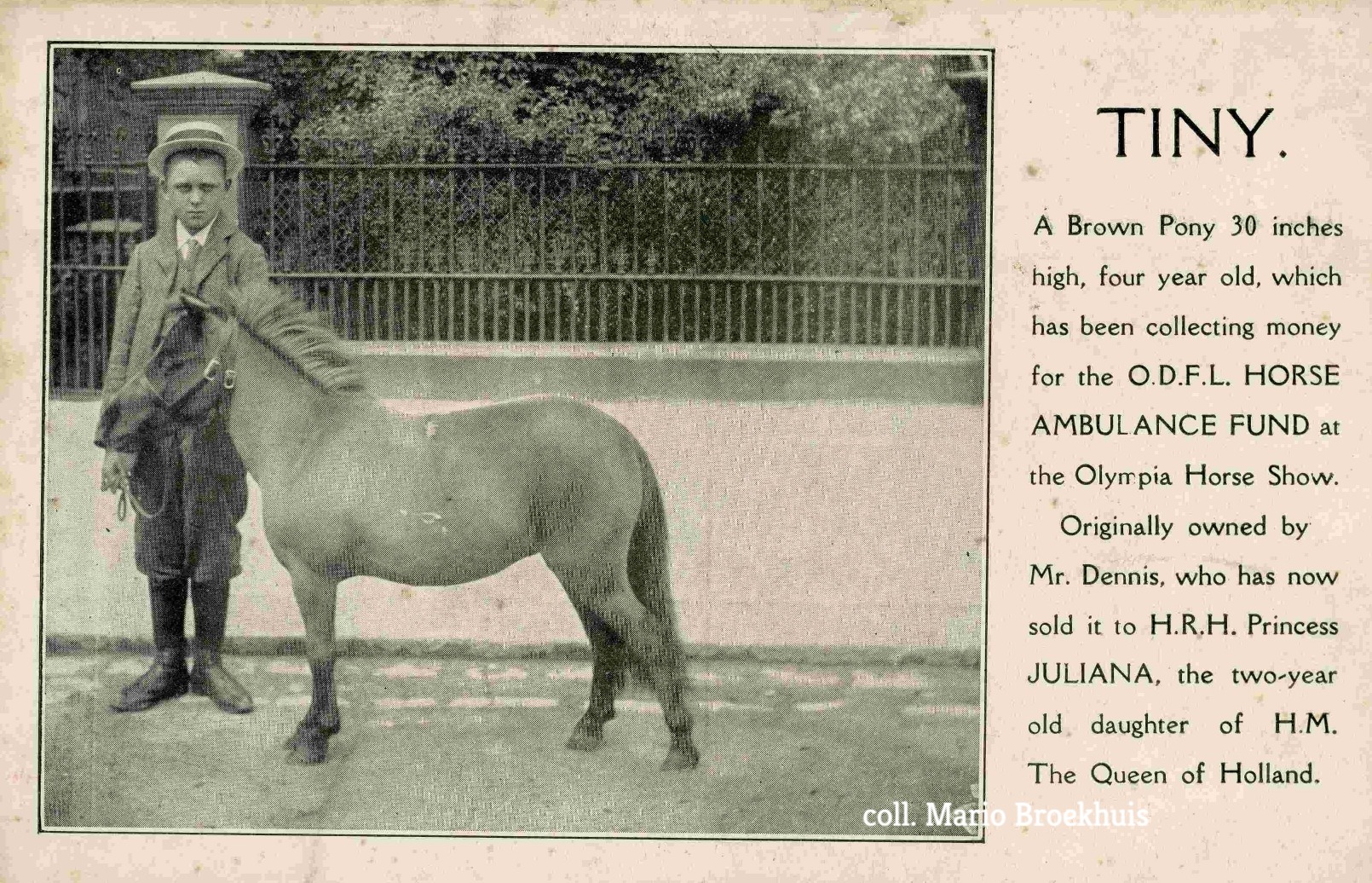 De Haagsche Courant (21-6-1912) weet te vertellen: “In een Engelsche krant lezen wij, dat op de internationale paardententoonstelling in Olympia te Londen een hitje is aangekocht namens onze Koningin; het paardje, dat Tiny heet, is bestemd voor prinses Juliana. Het is vijf jaar oud, 75 cm hoog en bruin van kleur. Het aardige beestje is zeer mak, geeft pootjes en zoentjes en kan gerust door ’t Prinsesje zelf gemend worden. Het was eigendom van de gebroeders Denis, rijtuigmakers te Kensington, die in opdracht hadden, een mooi klein wagentje te maken, geschikt voor het hitje. Dat wagentje zal met het paardje naar Holland worden nagezonden.” Op de International Horse Show delen de gebroeders Denis briefkaarten uit met foto en het verhaal dat Tiny verhuist naar de koninklijke stallen. Maar Tiny is er nooit in het stalregister ingeschreven, evenmin is er een factuur van de verkoop te vinden. Mogelijk heeft Tiny de Noordzee nooit over gestoken of blijkt het diertje een gezondheidsprobleem te hebben, waardoor de handel niet doorgaat.