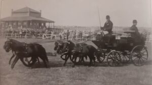 Koningin Wilhelmina rijdt de pony’s in het tandem voor de tonneau door de duinen