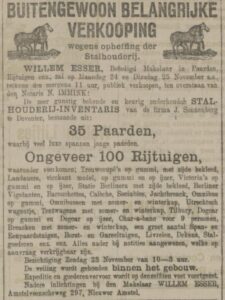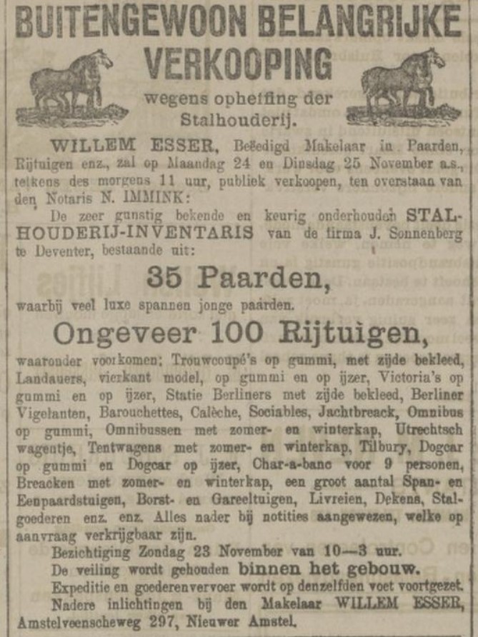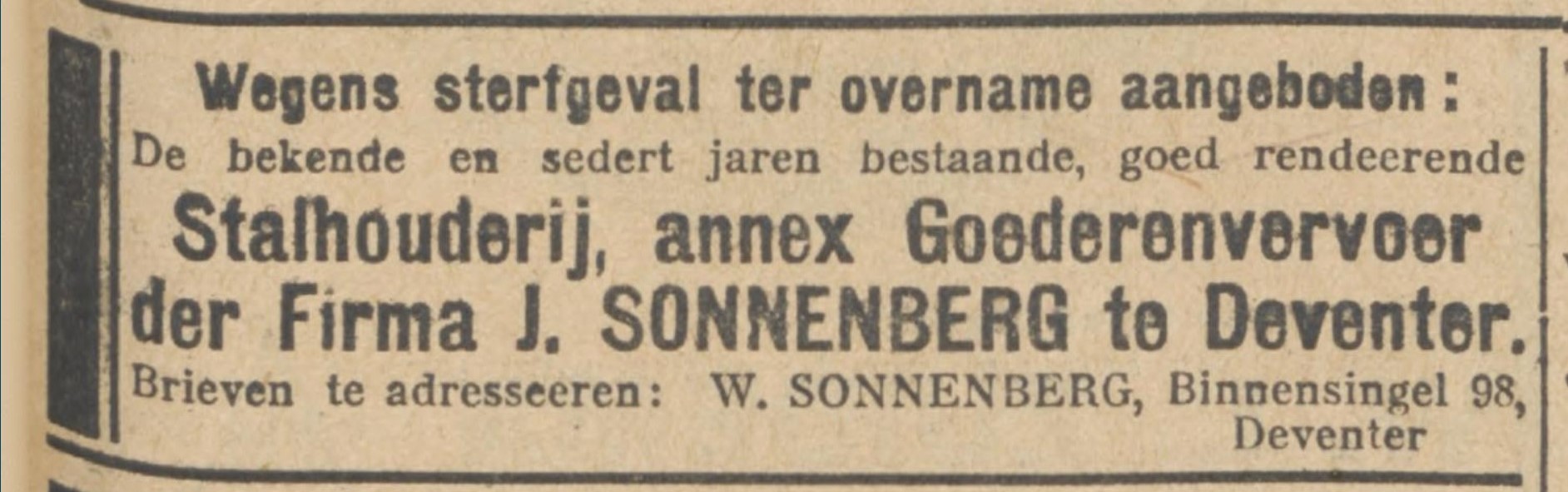 Zes jaar na de nieuwbouw, in november 1919 vindt er een opheffingsverkoping plaats van 35 paarden en ongeveer 100 rijtuigen, waaronder trouwcoupés op gummi en met zijde bekleed, landauers van vierkant model, victoria’s, statie-berliners, vigilantes, een calèche, de jachtbreak, omnibussen en een char-à-banc voor negen personen. De opheffing is het directe gevolg van de looneisen van de koetsiers. “In verband met de hooge looneischen van het personeel ‘heeft de firma Sonnenberg te Deventer besloten, haar zeer omvangrijke stalhoudersbedrijf met ingang van 15 november geheel en al stop te zetten; slechts het sleepersbedrijf wordt verder geëxploiteerd, zonder stalhouderij, want de firma S. heeft vrijwel het monopolie. Vermoedelijk zal van dit besluit een belangrijke toeneming der werkloosheid het gevolg zijn”, aldus de Apeldoornsche Courant (23-10-1919). Maar het meest opvallende is dat in Deventer vrij acuut na de verkoping een rijtuignood ontstaat. In de gemeenteraad komt aan de orde dat het voor begrafenissen van gemeentewege onmogelijk is om nog volgkoetsen te krijgen. “Bij de rondvraag werd in den Raad van Deventer ter sprake gebracht de moeilijkheid, waarin men is geraakt, nu de firma Sonnenberg, die de stalhouderij te Deventer op uitgebreide schaal en vrijwel als monopolie exploiteerde, zich door de steeds hoger wordende bedrijfskosten, mede gevolg van de looneischen der koetsiers, genoodzaakt heeft gezien, de stalhouderij er aan te geven, waardoor het onmogelijk is voor begrafenissen, die hier vanwege de gemeente geschieden, de nodige volgkoetsen te krijgen. Het plan werd geopperd een auto-lijkwagen aan te schaffen, opdat ook de volgrijtuigen uit auto’s zouden kunnen bestaan, maar de beslissing werd niet genomen. Toch is de zaak urgent, want het plotselinge rijtuiggebrek heeft hier reeds tot zonderling consequenties geleid, niet alleen waar het begrafenissen, maar ook waar het trouwpartijen, doopfeesten e.d. betreft. Het trouwen per auto is nu schering en inslag, doch van deze moderne voertuigen zijn uiteraard slechts weinigen beschikbaar, zoodat velen te voet moeten gaan, wat op verre afstanden veel last bezorgt.” (De Telegraaf 26-11-1919)