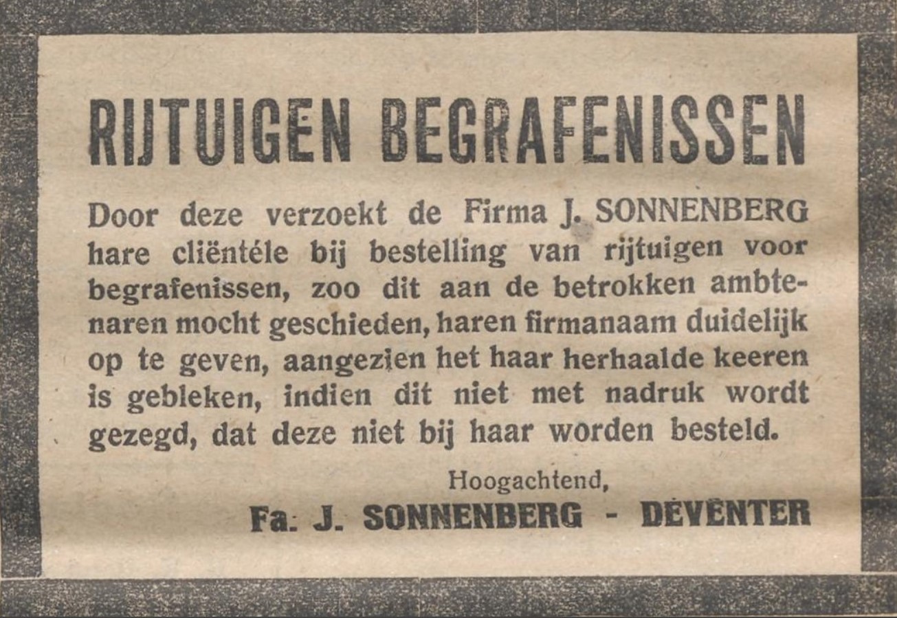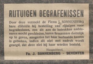 Ondanks dat de rijtuigen hoegenaamd zijn afgeschaft, gaat Sonnenberg door met het goederenvervoer, als ‘sleepersbedrijf’ zoals dat toen heette. Welk spel Sonnenberg heeft gespeeld is niet geheel duidelijk, maar drie jaar later is de stalhouderij weer volop actief met het leveren van volgrijtuigen voor begrafenissen.