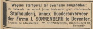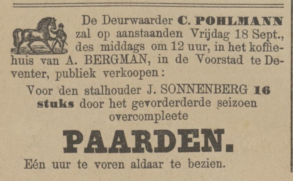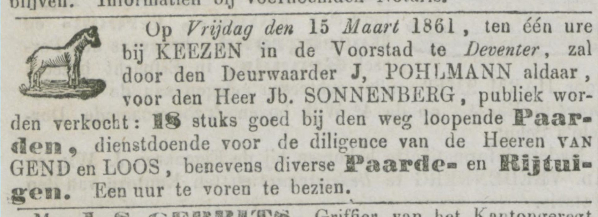 In Deventer levert in de jaren 1860 en mogelijk al eerder, Jacob Sonnenberg de paarden voor de diligencedienst van Van Gend & Loos. Achttien stuks heeft hij er voor gereserveerd in 1861. Van de in Deventer geboren Jacob Sonnenberg (1787-1862) weten we niet zo veel, behalve dat hij in 1846 eventjes ‘meijer’ (opzichter) is van het buitengoed Overvelde aan de Oerweg in Diepenveen, en tot zijn overlijden als stalhouder werkt. Na zijn dood volgt zijn gelijknamige zoon (1839-1909) hem op. Die trouwt twee jaar later met Hendrica Catharina Nikkels.