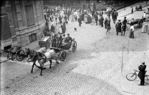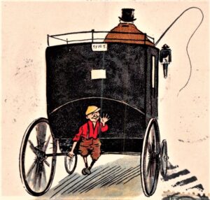 Foto boven: Koetsier Harm van Egmond, bijgenaamd ‘De Taaie’ en postrijder te Deventer, blies de hoorn om zijn komst aan te geven (Fotograaf Alex Roosdorp, Collectie Overijssel/Stadsarchief Deventer).