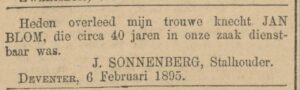 Sonnenberg heeft zijn mensen langdurig in dienst, zoals in maart 1895: “De stalhoudersknecht van den heer J. Sonnenberg, J. P. Vaupell hoopt op 17 dezer den dag te herdenken, waarop hij 25 jaar geleden bij den heer Sonnenberg in dienst trad.” Twee maand eerder nog had Jacob een rouwadvertentie geplaatst voor zijn trouwe knecht Jan Blom die overleed na veertig jaar dienstverband.