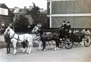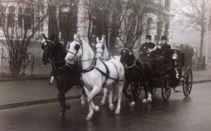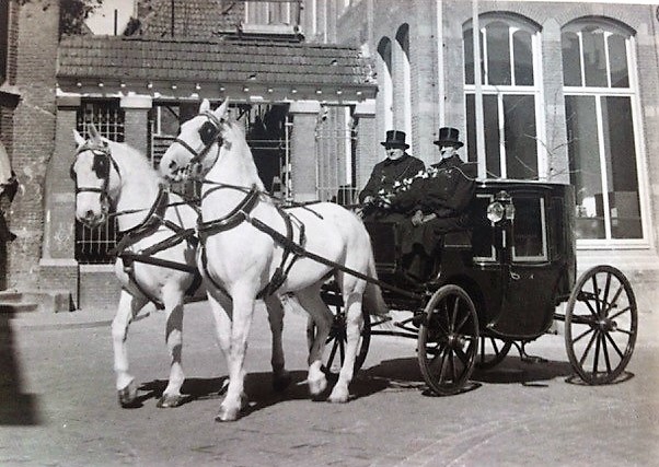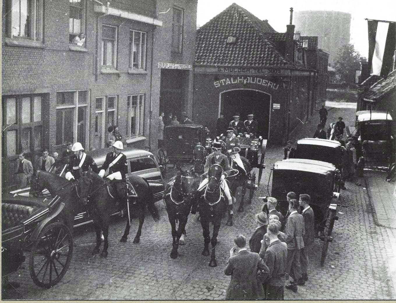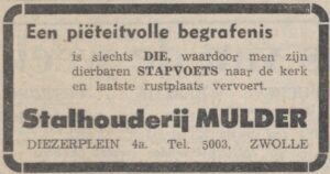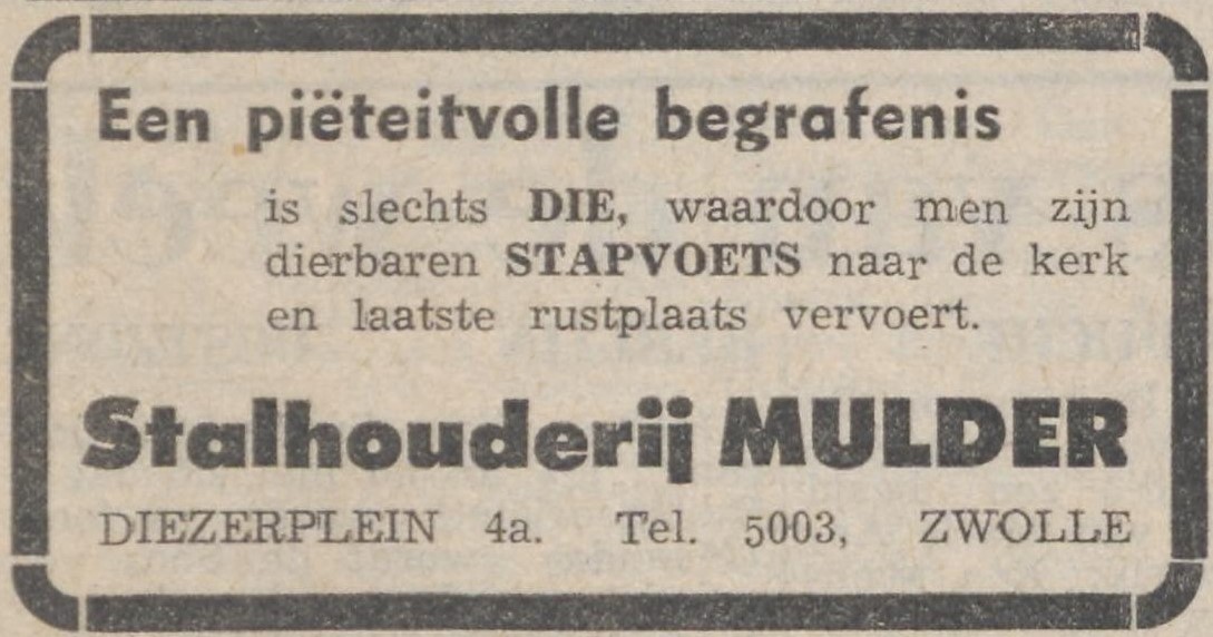 “Denk er niet aan. Alleen wanneer het zoover is, dat u er aan moet denken, denk dan aan Mulder’s stalhouderij. Met de meeste zorg wordt alles door ons geregeld”, adverteert Gait Mulder (1893-1967) in 1937 als begrafenisonderneming voor het werk dat de beste verdiensten oplevert. Mulder was gestart in 1919 met het overnemen van de stalhouderij van Van Til aan de Diezerkade, voor met name het verhuiswerk met tapissières en meubelwagens. Van Til ging zelf een eindje verderop in de Diezerstraat met automobielen en nam afscheid van de paarden. Mulder zag echter nog wel brood in paarden en breidde het werk uit naar trouwpartijen en begrafenissen. In de oorlogsjaren veertig voert zijn ‘Zwolsche Rijtuig Maatschappij’ stadsritten uit die een gulden per rit kosten en bij gladde weggesteldheid een kwartje meer wegens ‘scherp beslag’. Van een grotere luxe is het wanneer het koninklijk staldepartement bij Mulder aan gaat spannen voor het bezoek van prinses Juliana op 4 en 5 september 1945, een half jaar na de bevrijding van Zwolle.