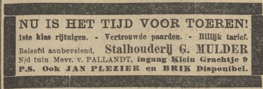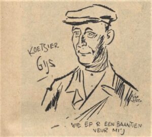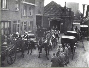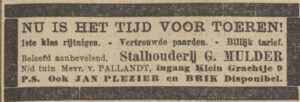 “Als kleine jongen leerde Gait bij het ouderlijk huis rijden, mennen, poetsen, toiletteren en al die andere dingen, die nodig zijn om in een stalhouderij je brood te kunnen verdienen. En zo was Mulder in 1919 in staat zijn eigen zaak op poten – of laat me in dit geval maar liever zeggen, op benen te zetten. Hij begon met twee paarden in een tijd, dat onze stad nog zeven stalhouderijen had, werkte hard en vooral met animo, van ’s ochtends half zeven tot ’s avonds, kocht de herenstal van baron van Pallandt aan het Klein Grachtje, breidde zijn bedrijf steeds uit en heeft nu dertig jaar later 17 paarden. De enige honderd procent-stalhouder in Zwolle, die de concurrentie van de auto overleefd heeft. ‘Wanneer een stalhouder zijn spullen goed verzorgt, dan kan hij zich handhaven’, zegt Mulder. Maar meevallen doet het in deze tijd niet. ‘M’n paarden vreten een kapitaal aan voer op, 1.000 kg hooi en 700 kg fijn paardenmeel in de week en verder is er haast niet aan materiaal te komen. Zover ik weet, is er in ons hele land geen speciale rijtuigenfabriek meer te vinden. Je moet dus steeds de oude bullen op laten knappen en vraag niet wat dat kost! Met de paarden gaat het nu weer iets gemakkelijker. In de oorlog ben ik er 22 aan de Duitsers kwijt geraakt. Je kreeg er dan wel ƒ 1.200 per stuk voor, maar wanneer ik weer een nieuwe moest kopen, had ik toch altijd een strop van een paar honderd gulden. Om rijk te worden, moet je de stalhouderij niet als je beroep kiezen. M’n vrouw en ik zijn blij als we heel gewoon rond kunnen komen en dan hebben we nog niet eens kinderen. Maar ja, je zwemt door, als je van je werk houdt.’ En dat doet Mulder. Praat over paarden en hij begint te glimmen van genoegen, vooral als je hem vraagt of hij er wel eens last mee heeft. ‘Nooit’, zegt Mulder en hij gaat er eens rechtop voor zitten, voor het raam van zijn bovenhuis op het Diezerplein. ‘De meesten schreeuwen te veel en zijn in hun hart bang. Je moet je nergens iets van aantrekken. Doorlopen met de hand in de zak. Niet dat benauwde! Als zijn ze nog zo ondeugend, ik span ze in. Alles span ik in, al is het ook een leeuw.’ ‘Opschepper’, zegt zijn vrouw en dan is het haar beurt om te vertellen, wat ze op haar hart heeft. ‘Ik houd van paarden. Zelf ben ik op een boerderij groot gebracht, waar nu Dijk zit bij de Vrolijkheid, maar misschien juist, omdat ik buiten opgegroeid ben, verlang ik er soms zo naar dit bovenhuisje om te ruilen voor een huisje buitenaf. Maar mijn man kan de zaak niet loslaten. Hij leeft erin en wat doe je dan als vrouw. Toegeven.’ Mulder lacht maar eens en vertelt dan verder over zijn omgang met paarden. ‘Het is allemaal een kwestie van aanvoelen. Ook het mennen. Zo kost het me niets geen moeite om met vier paarden te rijden. Vorig jaar, toen kardinaal de Jong hier was, heb ik het nog voor het laatst gedaan.’ ‘Liefhebberijen? Zondags met de brik er op uit. Wanneer het een beetje behoorlijk weer is, gaan mijn vrouw en ik op stap. En dan verder de landelijke rijsport. Van ‘Rijden is Kunst’ uit Ittersum ben ik bestuurslid.’ En zo ziet ge lezers, dat het me niet lukte hem van het paarden-chapiter af te brengen. Het kostte me zelfs moeite na twee uur luisteren het gezellig paarden-gepraat af te breken, want Gait Mulder is op dit gebied een goed en prettig verteller.” (Provinciale Overijsselsche en Zwolsche Courant 26-3-1949)