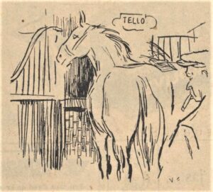 Het ging allemaal onder de hamer, na door ’n hulp van de veilingmeester omhoog te zijn gehouden. Twaalf witte Engelse dassen, bokjassen in diverse kleuren, zomer jassen, rijschorten-schootkleedjes, allerlei soorten tuigen, zadels, hoofdstellen, trensen en halsters, teugels, halshout, leerwerk en op het laatst de twee trouwcoupeetjes, de landauers, de concoursspiders, de wagonette. Lijkkoetsen ook en staatsiekoetsen en niet te vergeten de antieke Jan Plezier. Op het einde van de lijst stonden de veertien paarden, tuigpaarden en concourspaarden, chique rijpaarden, kortom: de ziel van het bedrijf van Mulder. Het werd allemaal verkocht, voetstoots zonder actie of reactie, zichtbare of verborgen gebreken, gezien of niet gezien, in elk geval contant met elf cents opgeld van elke gulden en tien cents nummergeld van elke koop, zoals artikel 1 van de veilconditiën luidde.” (Provinciale Overijsselsche en Zwolsche Courant 13-4-1956)