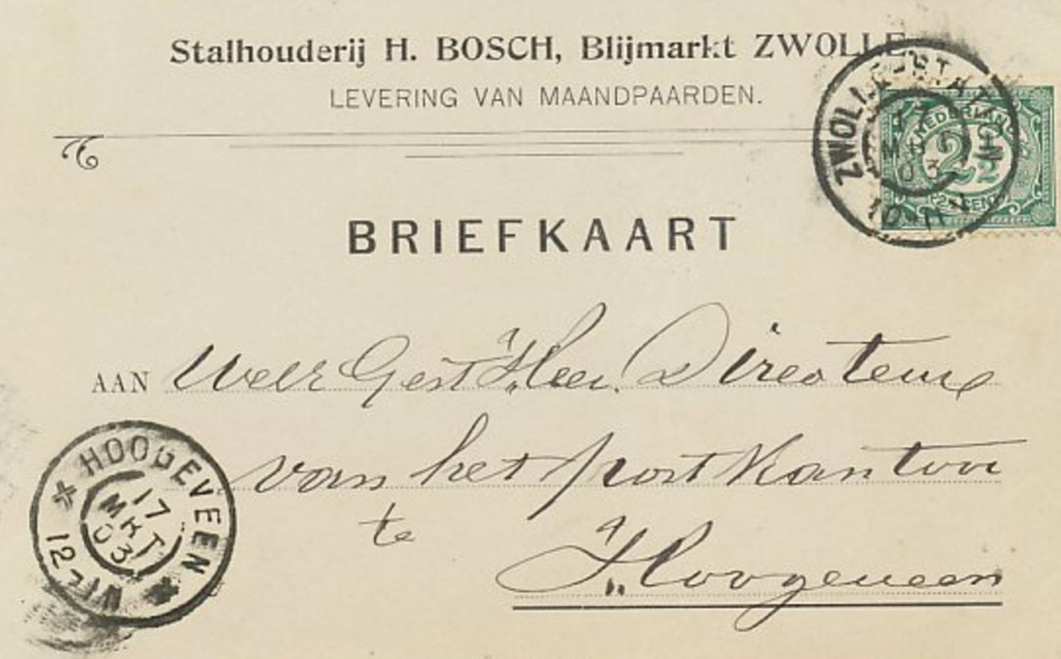 Soms grijpt Bosch mis. Op 26 oktober 1887 vindt bij logement de Hanekamp in opdracht van Bosch een verkoping plaats van tien paarden en “eenige rijtuigen, waaronder 3 postpakketrijtuigen op 4 wielen, geschikt voor reserverijtuigen der posterijen en voor groote bierkarren, zoomede eenige zeer goede postkarren.” In latere jaren krijgt Bosch het werk opnieuw gegund. Met een briefkaart vraagt de stalhouder in 1903 aan de directeur van het postkantoor in Hoogeveen wanneer de kleren van de postiljon klaar zijn. Het komt blijkbaar goed uit dat die kleren nog niet af zijn, want Bosch is ook nog niet ‘klaar’ met de postiljon, waarbij niet helemaal duidelijk is wat hij bedoelt. De bemanning van een postwagen bestond uit een ‘postiljon’ of beter gezegd koetsier van de stalhouderij, en een conducteur van de posterijen. De één verantwoordelijk voor het transport, de andere voor de brieven en pakketjes. In 1905 viert Hendrik Boomkens zijn dertigjarig jubileum als conducteur 1ste klasse op de routes van Zwolle naar Meppel, Assen en Almelo, dus op de postwagens van Bosch. De 66-jarige Boomkens krijgt er de eremedaille in de Orde van Oranje-Nassau voor. “Nergens voelt hij zich dan ook beter thuis dan in den postwagen, waarmede hij al die jaren bij nacht, en dag in weer en wind met den postiljon op den bok lief en leed, gure koude en verschroeiende warmte heeft gedeeld. Sneeuwwit is zijn haar en baard, maar jong en vol levenslust nog zijn hart en zijn persoon, dat zal ieder erkennen die hem uit den wagen ziet stappen of hem opgewekt ‘klaar’ tot den postiljon hoort roepen.” (Provinciale Overijsselsche en Zwolsche Courant 14-1-1905)