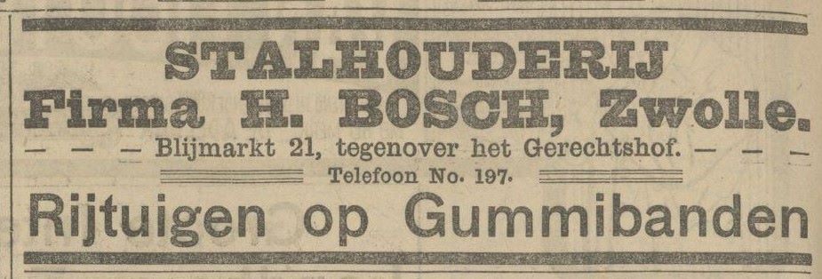 Beter gaat het met Bosch aan de Blijmarkt, waar na Hermanus ook zoon Hermannus (1860-1910) en kleinzoon Jan Hendrik (1867-1903) in de zaak komen. Niet dat het ze een halve eeuw van een leien dakje zal gaan, want in de jaren 1870 waart er bijvoorbeeld kwade droes rond in de kop van Overijssel, een uiterst besmettelijke paardenziekte met in de meeste gevallen een fatale afloop. Omdat kwade droes een serieus gevaar vormt voor met name de paarden in het leger, en daarmee de weerbaarheid van ons land, treedt de overheid streng op als het ergens uitbreekt. “Heden zijn de drie paarden van den stalhouder Bosch aan de Blijmarkt, die door den districts-veearts verklaard waren te lijden aan kwaden droes, afgemaakt, verbrand en begraven. Zij waren reeds drie weken buiten aanraking gehouden met de andere paarden van Bosch.” (Provinciale Overijsselsche en Zwolsche Courant 22-9-1876)