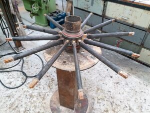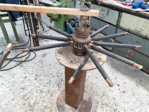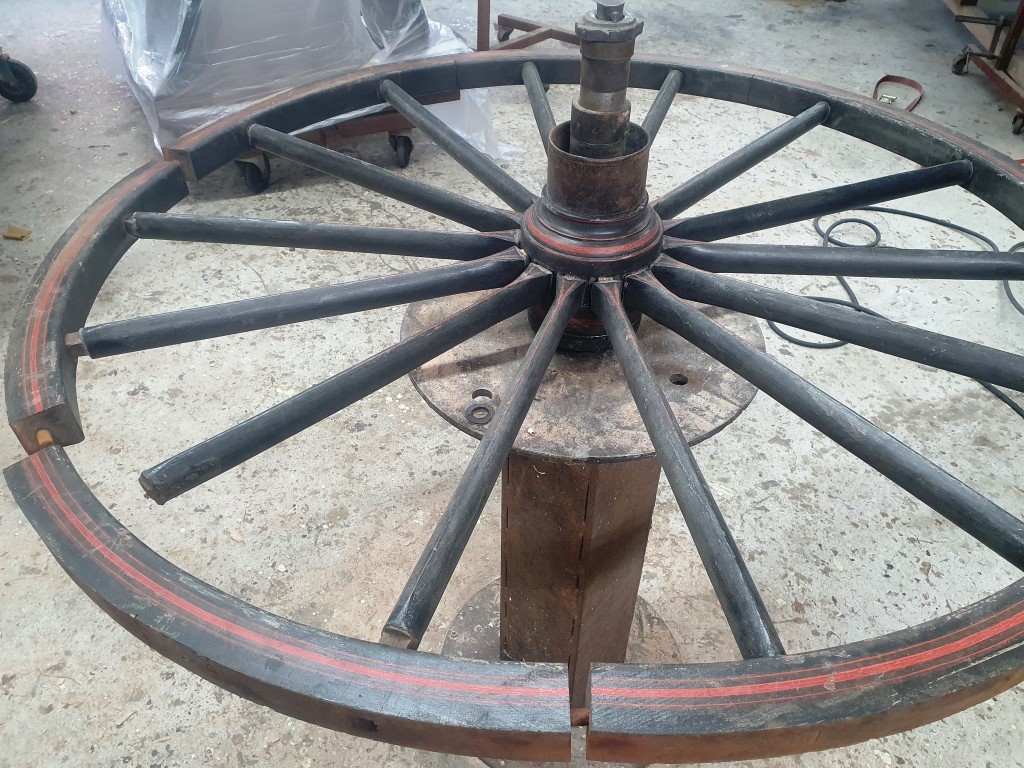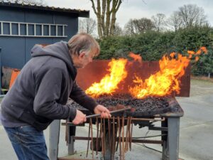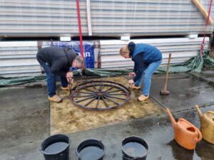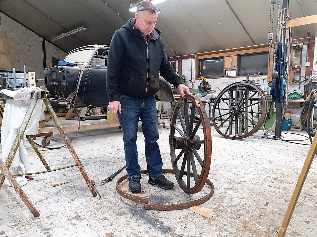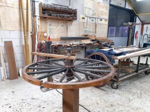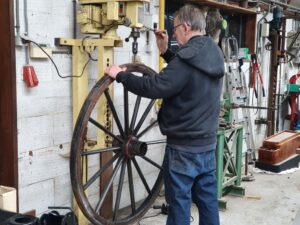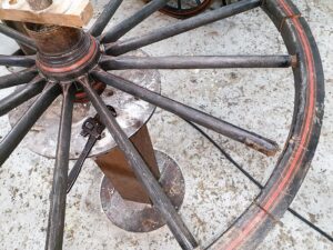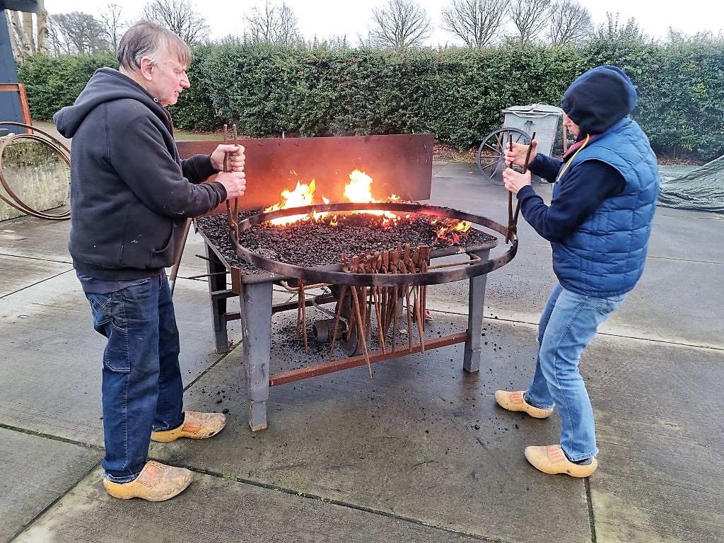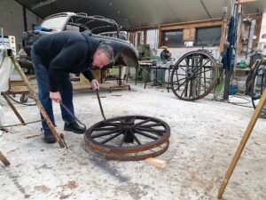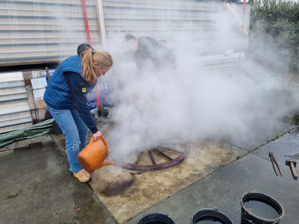 Het leggen van ‘hoepels’ om rijtuigwielen is altijd een spectaculair gezicht: het oplaaiend smidsvuur, roodgloeiend ijzer en de stoomwolken die ontstaan als de wagenmaker koud water over de gelegde hoepels giet. Het is een van de slotakkoorden in de restauratie van de phaeton van Slot Zuylen.