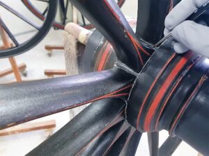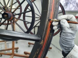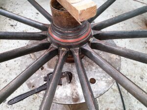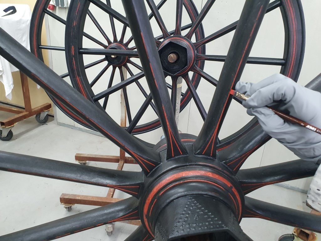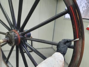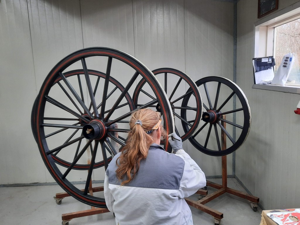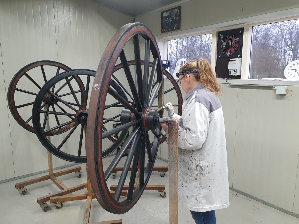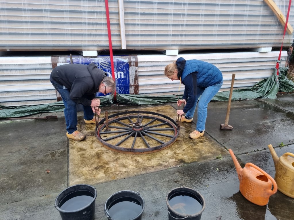 De ‘hoepels’ zijn de wielbanden die een wiel bij elkaar houden. Als gevolg van een te droog klimaat in een ruimte waar een rijtuig staat opgeslagen, krimpt het hout van een wiel en gaan de ijzeren banden loszitten. Daarmee komt de constructie van het wiel in gevaar. Het was een probleem met de wielen van de phaeton van Slot Zuylen. Vandaar dat restaurator Piet Stolk de ijzeren hoepels er heeft afgehaald en iets ingekort. In het smidsvuur zet het ijzer vervolgens net genoeg uit om de hoepel opnieuw om het houten wiel te kunnen leggen, en door het gelijk daarna flink af te koelen met koud water krimpt de hoepel als vanouds muurvast om het wiel. Als laatste in de restauratie van de wielen reinigt en retoucheert Maria Stolk de oude verflagen en de biezen. Een impressie: