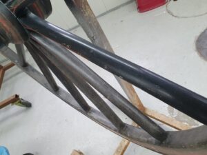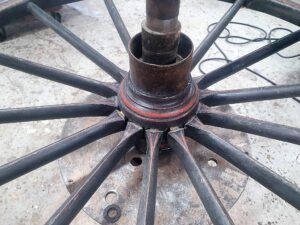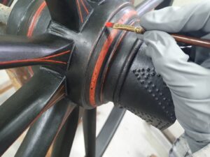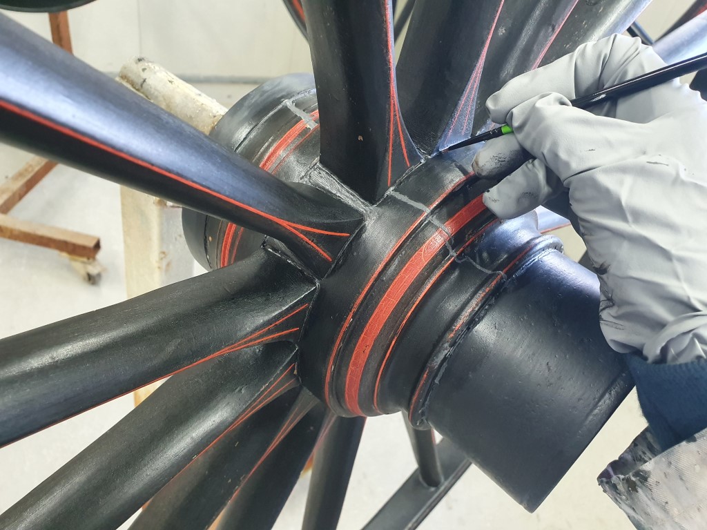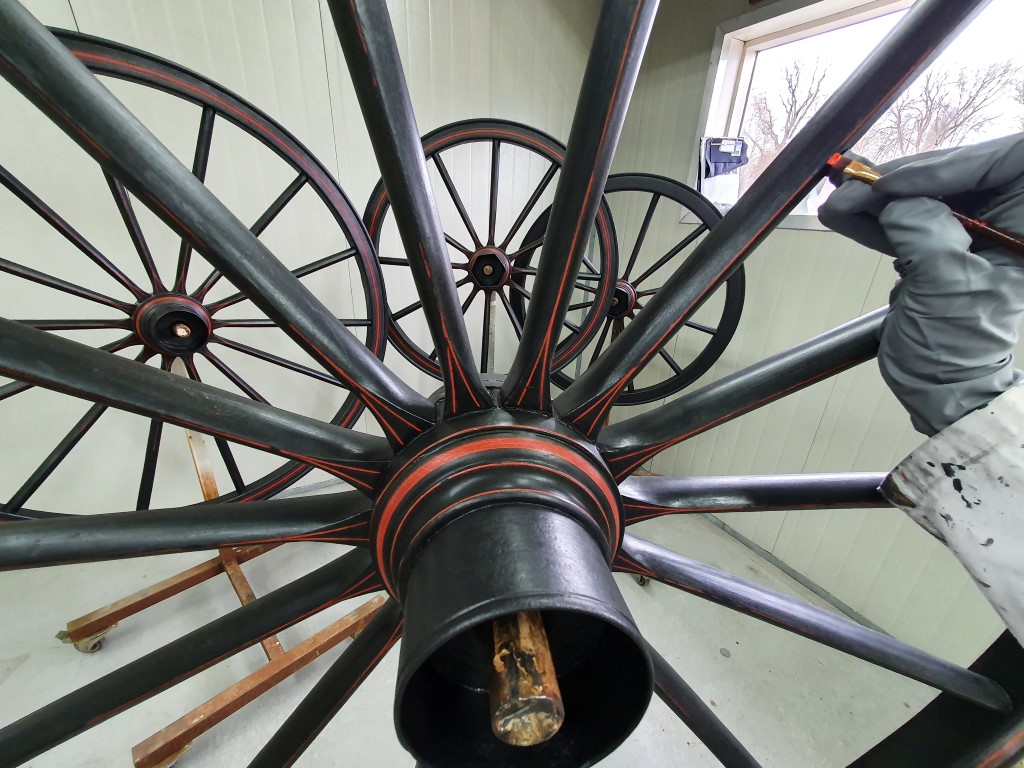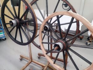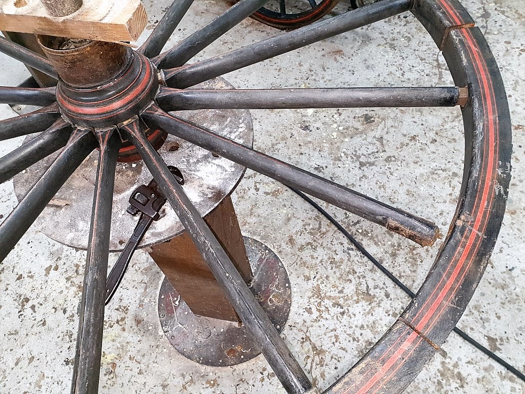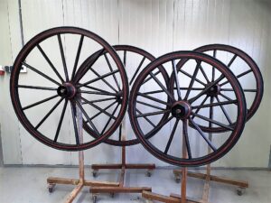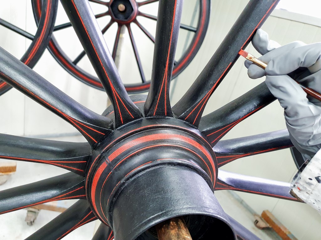De ‘hoepels’ zijn de wielbanden die een wiel bij elkaar houden. Als gevolg van een te droog klimaat in een ruimte waar een rijtuig staat opgeslagen, krimpt het hout van een wiel en gaan de ijzeren banden loszitten. Daarmee komt de constructie van het wiel in gevaar. Het was een probleem met de wielen van de phaeton van Slot Zuylen. Vandaar dat restaurator Piet Stolk de ijzeren hoepels er heeft afgehaald en iets ingekort. In het smidsvuur zet het ijzer vervolgens net genoeg uit om de hoepel opnieuw om het houten wiel te kunnen leggen, en door het gelijk daarna flink af te koelen met koud water krimpt de hoepel als vanouds muurvast om het wiel. Als laatste in de restauratie van de wielen reinigt en retoucheert Maria Stolk de oude verflagen en de biezen. Een impressie: