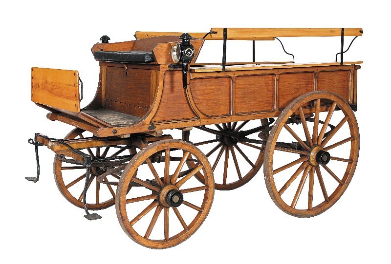 In volgorde: verenwagen (kaasbrik) in 2007 geveild door veilinghuis Hessink, advertentie in