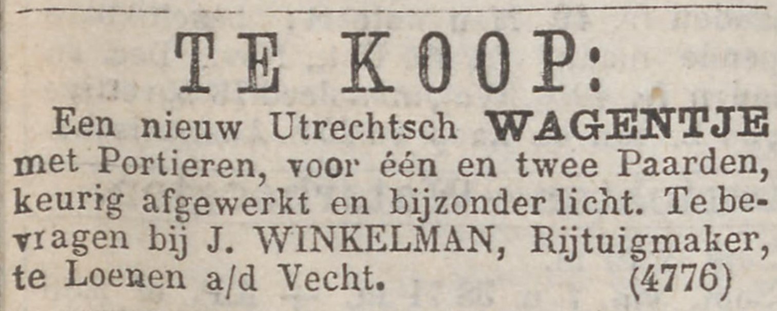 Met het overlijden van Cornelis Stam komt er een plaats vrij voor een jonge rijtuigmaker in Loenen aan de Vecht. “Te koop: de van ouds gunstig bekende wagenmakerij, te Loenen a/d Vecht, met de daarbij behoorende gereedschappen en materialen. Te bevragen bij den notaris Evert van Beusekom Ezn., aldaar”, luidt de annonce in het Nieuws van den Dag op 12 maart 1875. Jan Winkelman heeft er het jaar volgend een ‘nieuw Utrechtsch wagentje met portieren, voor één en twee paarden, keurig afgewerkt en bijzonder licht’ te koop. Hij gebruikt in navolging van Stam de term ‘rijtuigmaker’ om het onderscheid te maken met de boerenwagenmakers in de Gooi- en Vechtstreek. Toch bestaat al in de tijd van Stam de klandizie vooral uit boeren en middenstanders, met ter afwisseling wat reparatiewerk aan de chiquere rijtuigen op de buitenplaatsen. Dat is wat Winkelman overneemt.