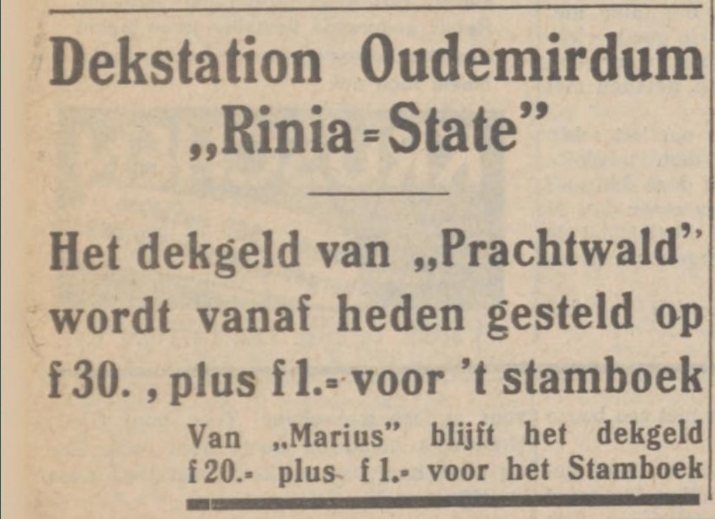 Wij hoorden zoo ook nog het een en ander de voornaamste prestaties van den stal Rinia. En hieraan kunnen wij nog toevoegen, dat reeds de volgende week deze collectie wordt verrijkt met twee jonge merries, die werden aangekocht van Roelof Lettinga te Stiens, genaamd Germea, kampioen ster, en Toteline, tezamen een dikke ƒ 6.000 gekost hebbende en verreweg de duurste paarden van dezen boeldag.”