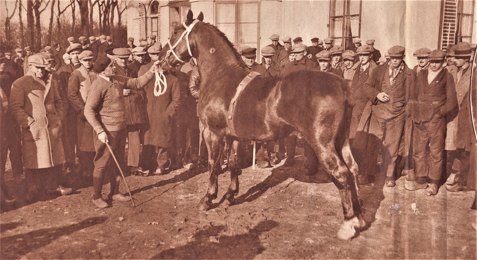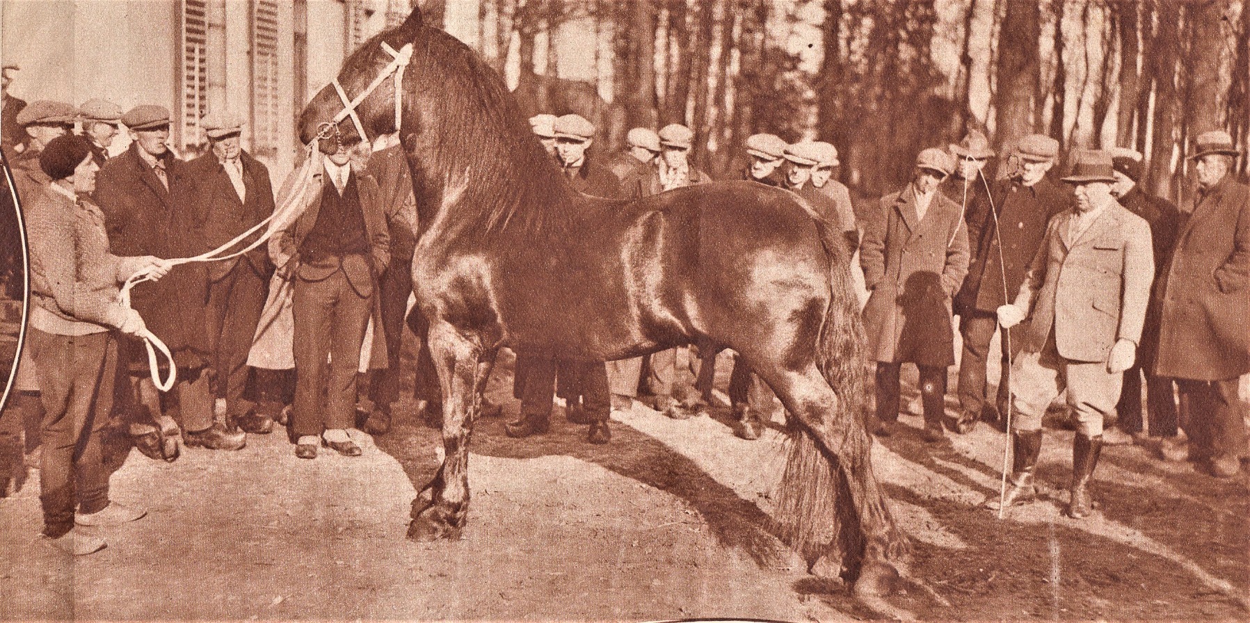 De Oost-Friese hengst Cesar tijdens de jaarlijkse hengstenmonstering op de Riniastate. Uit Fan Frsyke Groun 15-3-1935. (Bron beeld: www.langsdeluts.nl)