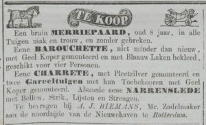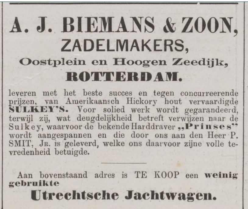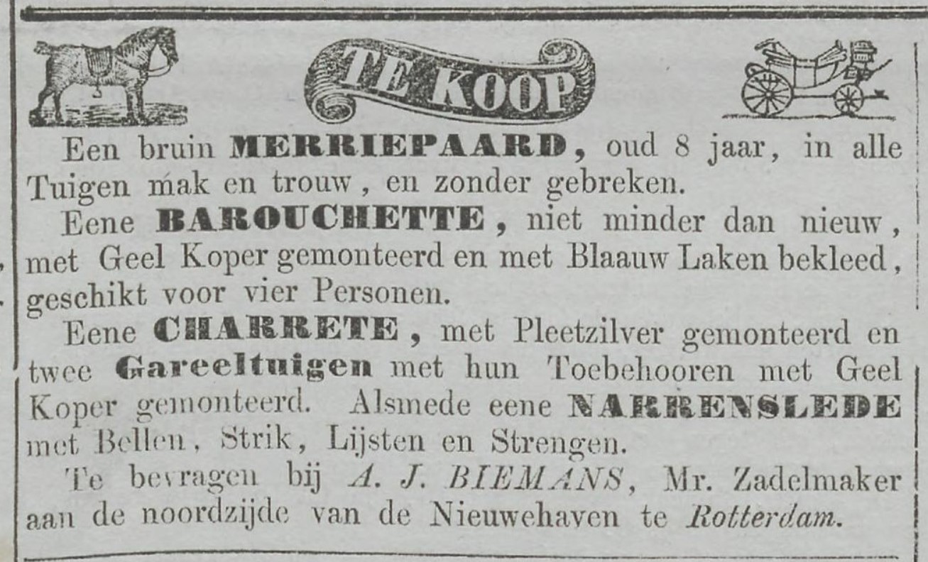 Weliswaar zijn de gilden in de stad al ten tijde van Napoleon afgeschaft, de meestertitel is nog niet verdwenen en het vervaardigen van een rijtuig gebeurt nog regelmatig in samenwerking tussen zelfstandige ambachtslieden. “Wij vernemen dat bij den mr. zadelmaker A.J. Biemans, aan het Oostplein alhier, een rijtuig in gereedheid is, bestemd om in de helft der volgende week naar Batavia te worden overgebragt, van waar de bestelling is uitgegaan. Volgens het oordeel van deskundigen is dit een der fraaiste in die soort van rijtuigen, die hier ter stede vervaardigd zijn, en kan het, zoowel wat eleganten vorm als het fraai beloop der kromme lijnen en soliditeit der verschillende deelen betreft, niet alleen met de buitenlandsche ruimschoots wedijveren, maar overtreft die in vele opzigten. Alles is binnen onze stad vervaardigd, zijnde zulks geschied door J. Snel, mr. wagenmaker; F. Peters, mr. smid; A.J. Biemans, mr. zadelmaker, en T. Leemann, mr. schilder. Ook een paar uiterst fraaije paardentuigen zijn hierbij door den heer Biemans vervaardigd. Wij noodigen diegenen onzer stadgenooten uit, die belang stellen in den vooruitgang van dezen tak van industrie in onze stad, dit schoone rijtuig eens in oogenschouw te nemen.” (Rotterd. Cour. 18-8-1854). Aan de Nieuwe Haven heeft Biemans een groot ‘spatieus’ huis in eigendom, dat hij verhuurt.