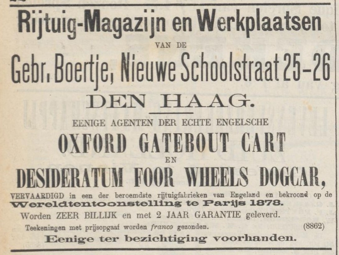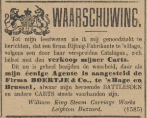 De gebroeders importeren Engelse rijtuigen als de ‘Oxford Gatebout Cart’ en de ‘Desideratum Foor Wheels Dogcar’, die ze met twee jaar garantie verkopen, en ondanks dat ze de Engelse taal misschien niet geheel meester zijn –‘desidaterum’ is slechts een moeilijk woord voor noodzakelijk en ze bedoelen ‘four wheeled’ dogcart- verloopt het contact met Engeland uitstekend. Van overzee komen namelijk ook “echt Engelsche heeren en dames dogcars uit de fabriek van de heren King, Morgan & Co te London.” En van één Engelse fabriek claimen de Boertjes het exclusieve recht. “Tot mijn leedwezen zie ik mij genoodzaakt te berichten, dat een firma Rijtuig-Fabrikante te ’s Hage, volgens een door haar verspreiden catalogus, zich belast met den verkoop mijner Carts. Dit nu is geheel bezijden de waarheid, daar als mijn éenige Agente is aangesteld de Firma Boertje & Co., te ’s Hage en Brussel, alwaar mijn beroemde Battlesden en andere carts steeds voorhanden zijn. William King Steam Carriage Works Leighton Buzzard.” (Het Vaderland 9-3-1885)