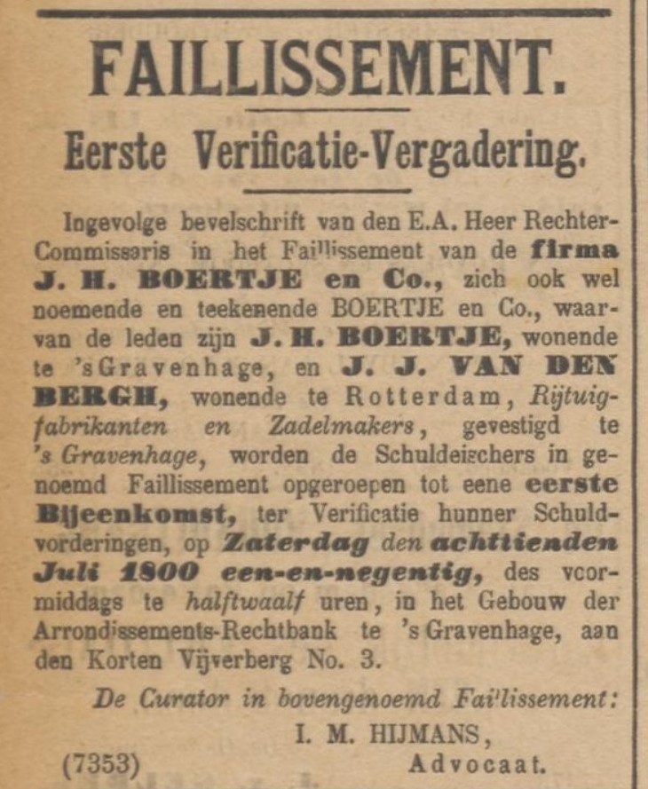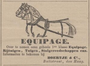Balistraat klinkt toepasselijk voor de ‘specialist in Indische equipages’, maar de firma is niet bepaald naar een betere plek verhuisd, zo blijkt uit klachten in Het Vaderland (21-2-1885) over stank in de stad: “Mestvaalten, die voor het grootste gedeelte een hevigen stank verspreiden door keukenafval, afval van groenten, ja zelfs doode honden en katten, die in rottenden toestand verkeeren. Deze plaatsen zijn gelegen: Balistraat naast de rijtuigfabriek van Boertje.” Dat kan Jakob er echter niet van weerhouden om dat jaar een rijtuig van eigen fabricaat in te zenden naar de Wereldtentoonstelling in Antwerpen, met een bronzen medaille als resultaat. Naast de nieuwbouw is het vooral handel in tweedehandsrijtuigen. Met prijzen die uiteenlopen van ƒ 175,- voor een phaeton met losse kap, ƒ 225,- voor een victoria en een vigilante die ƒ 200,- kost, zijn het redelijke prijzen alhoewel dit lastig te beoordelen is omdat we niets weten van de werkelijke staat. Importrijtuigen verkopen ze ook: een Amerikaanse t-cart en voor wie hard wil gaan, echte Amerikaanse sulky’s. In 1885 komt er een vestiging in Brussel bij, maar of het lukt om in België voet aan de grond te krijgen is zeer de vraag. In Brussel en Antwerpen zitten vanouds de beste rijtuigfabrikanten van de lage landen en er valt niet tegen te concurreren. De toevoeging ‘Brussel’ naast Den Haag als vestigingsplaats is vier jaar later ingeruild voor Rotterdam.