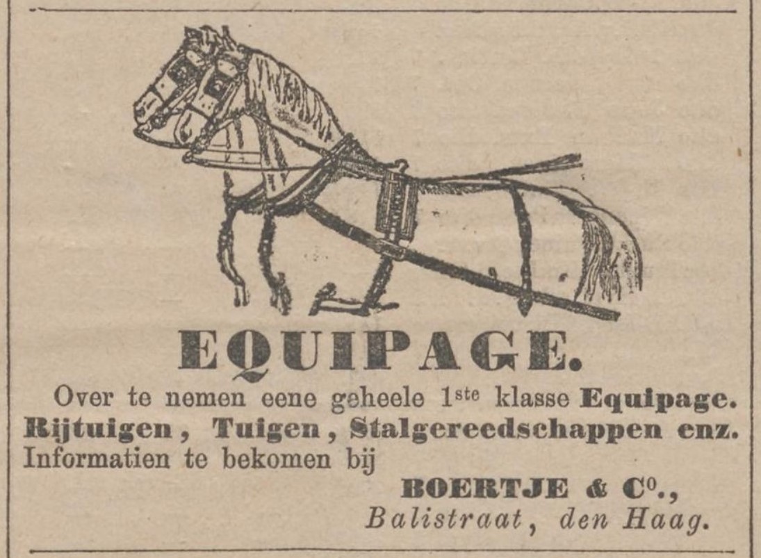 Pieter Boertje uit Dubbeldam kent als koetsier veel mensen in Haagse ‘paardenmilieu’, hij is getuige bij de huwelijken van een rijknecht, andere koetsiers, een schilder en een timmerman. Het wijst er ook op dat hij bekend is met de rijtuig- en zadelmakers in de stad, iets dat van pas komt om een leerplek te zoeken voor zijn zonen. Pieter woont aan de Nieuwe Schoolstraat in Den Haag en heeft tegen de tijd dat zijn vrouw Anna in 1871 overlijdt twee zonen die een eigen onderneming starten: de zadelmaker Jakob Hendrik Boertje (1843-1920) en de rijtuigschilder ‘Jan’ Johannes Marinus (1849-1884). Zij openen een rijtuigmagazijn en werkplaats aan de Nieuwe Schoolstraat 25 en 26.