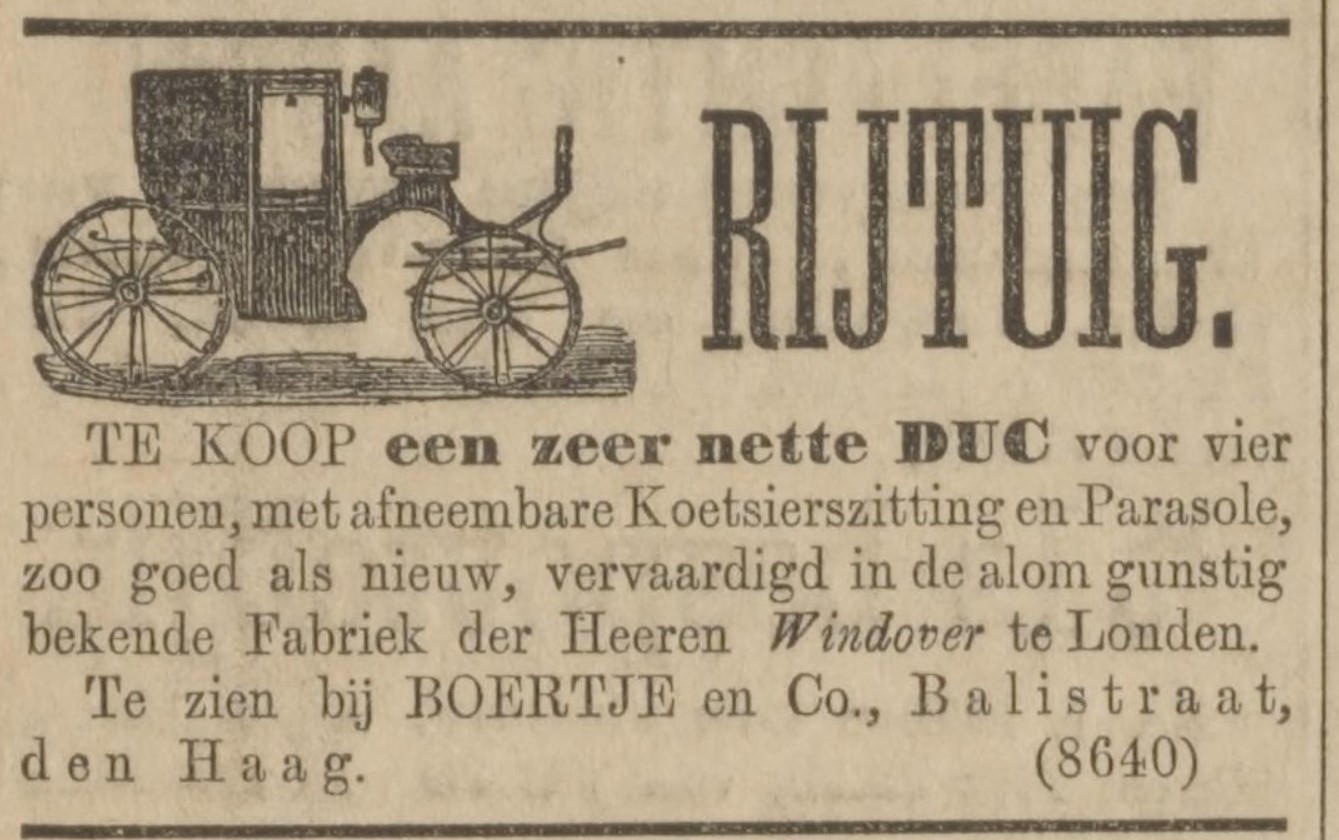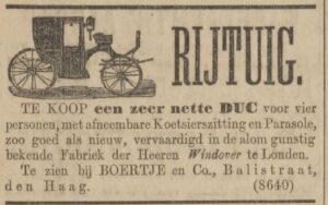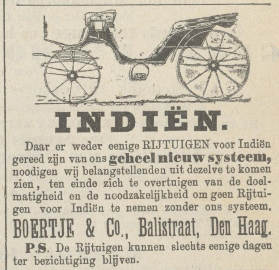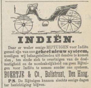De nieuwe firma Boertje & Companie zet zijn zinnen op de export naar Nederlands Indië. Niet alleen zijn voorhanden: het juist afgewerkte nieuwste model mylord, ze verzorgen ook de export naar Oost- en West-Indië en zijn het agentschap van Engelse en Franse rijtuigen. Met het oog op de vele oud-Indië-gangers die neerstrijken in de omgeving van Arnhem zetten ze nog een advertentie in de Arnhemsche Courant (4-9-1883): “Daar er weder eenige rijtuigen voor Indiën gereed zijn van ons geheel nieuw systeem, noodigen wij belangstellenden uit dezelve te komen zien, ten einde zich te overtuigen van de doelmatigheid en de noodzakelijkheid om geen rijtuigen voor Indiën te nemen zonder ons systeem. Boertje & Co, Balistraat, Den Haag. P.s. De rijtuigen kunnen slechts eenige dagen ter bezichtiging blijven.” Dat systeem blijkt ‘à triple suspension, systeem gebrevetteerd’ te zijn oftewel iets met drie veerbladen.