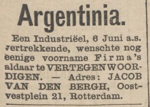 Nu hij toch in Rotterdam woont, stapt Van den Bergh er op de boot naar een land waar, zo denken ze, nog geen rijtuigproductie plaatsvindt: “Per stoomschip Schiedam vertrekt heden het eerste transport rijtuigen uit ons land naar de Argentijnsche Republiek. Zij zijn vervaardigd in de fabriek van rijtuigen en omnibussen van de heeren Boertje & Co, Rotterdam – Den Haag, terwijl een lid der firma zich mede naar Buenos-Ayros begeeft, ten einde persoonlijk zich te overtuigen in hoeverre deze tak van nijverheid met succes in Zuid-Amerika zou beoefend kunnen worden.” (Vlaardingsche Courant 5-6-1889). Naast de rijtuigen die Van den Bergh meeneemt wil hij van de gelegenheid gebruik maken om er ook andere firma’s en producten te promoten, hetgeen weinig tot niets oplevert. Het Argentinië-avontuur loopt op niets uit.