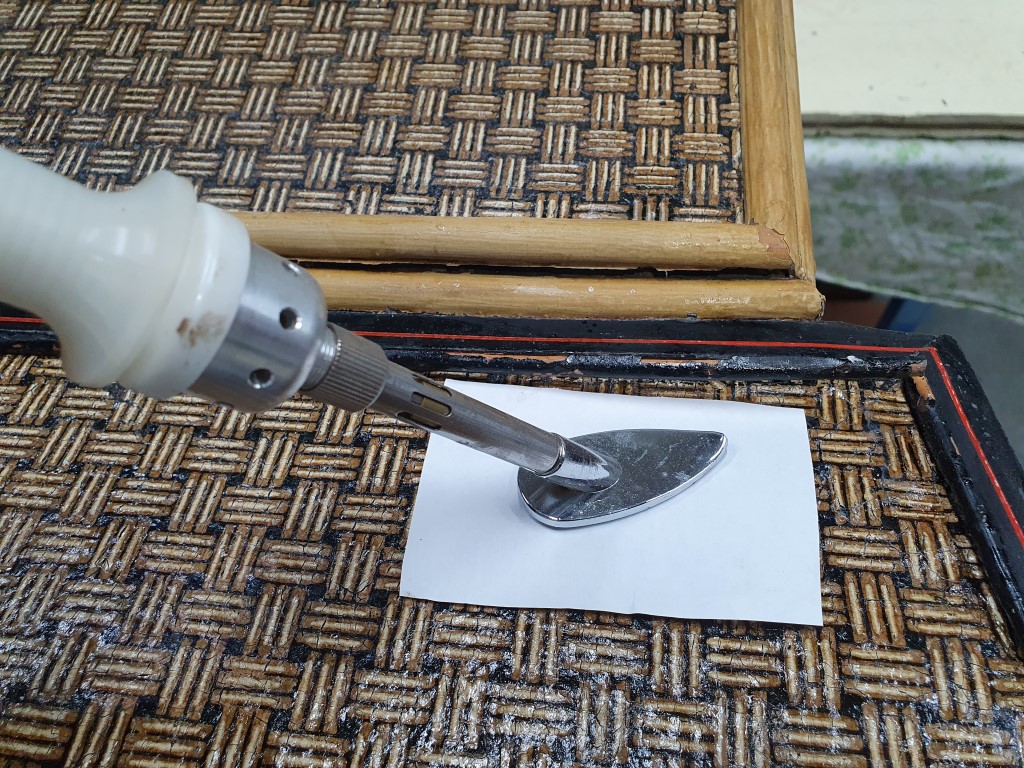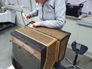 Verder is de door houtworm vermolmde vloer is verwijderd en als moeilijkste is de loslatende verf vastgezet. Dat laatste noemen ze bij Stolk in Balkbrug ‘consolideren’ en gebeurt met een ‘warme spatel’, een soort strijkboutje waardoor de oude verf weer een beetje gaat vloeien. Het is dezelfde specialistische techniek als bij de restauratie van schilderijen.
