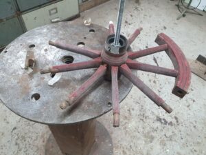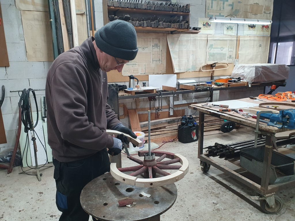 In de afgelopen twee weken zijn er al flinke stappen voorwaarts gemaakt in de restauratie van het ‘gevonden’ rijtuigje: het is uit elkaar gehaald, vergane wielsegmenten zijn vervangen.