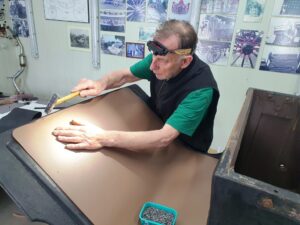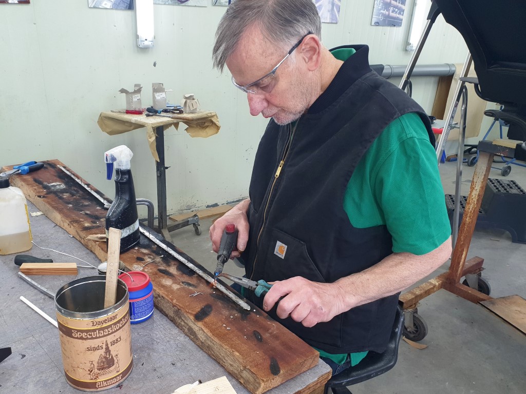 “De voorste kap is klaar, de hemel binnenin en de leren kap om het voorraam zijn samen genaaid. De oude (zwart gelakte) lijsten zijn gerestaureerd en bevestigd. De kap is al 1x open geweest en het ziet er allemaal goed uit. Het linoleum op de voorschulp en tapijt binnenin zijn klaar. De wielen zijn 2x vernist en helemaal klaar. Schamel volgt snel. Met name de daklijsten worden nu verder afgewerkt om vervolgens te beginnen met de vernislagen op de bak. Tussendoor is steeds droogtijd/doorharding nodig. De twee kappen moeten worden gevoed. Daarna kan het rijtuig worden opgebouwd. Pas dan kunnen de lampen op het rijtuig en in de houders worden gemaakt. Het risico bestaat anders dat ze scheef komen te staan ten opzichte van het rijtuig. En kan de voorbewerkte disselboom verder pas worden gemaakt in het huis en op de juiste hoogte, vervolgens verder afgewerkt. En dan resten nog de rolgordijntjes….”