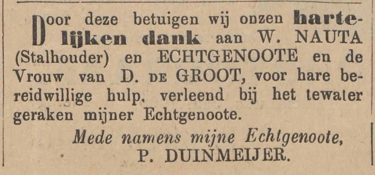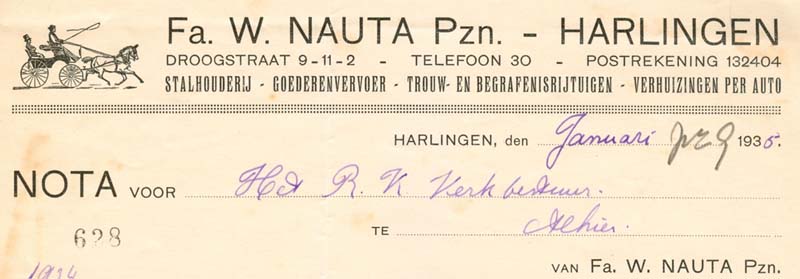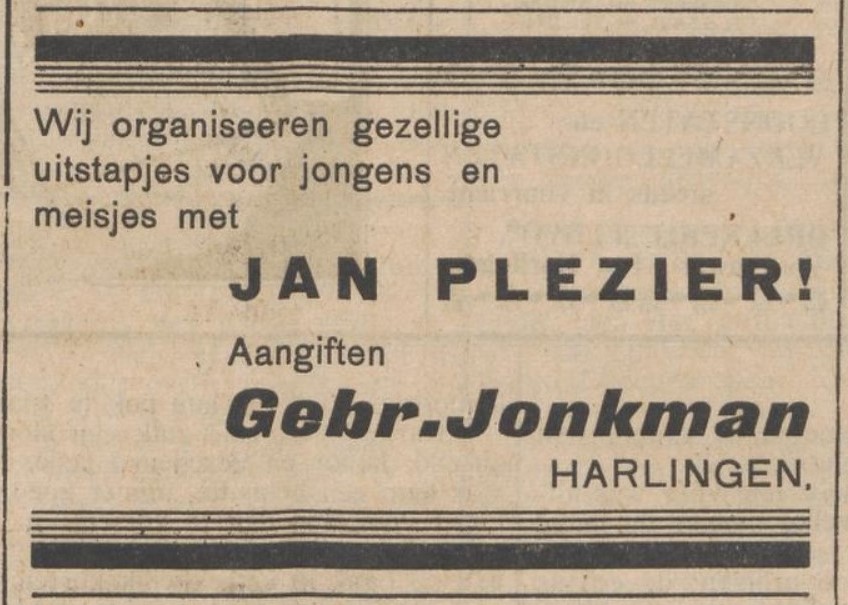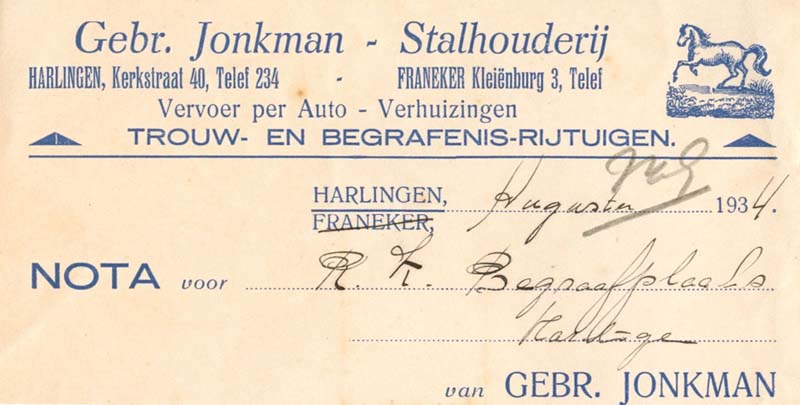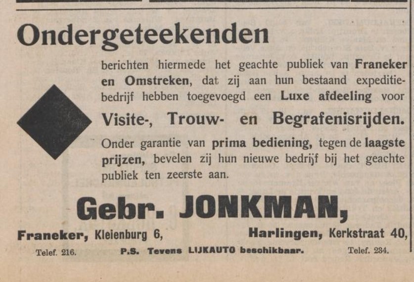 “Ondergeteekenden berichten hiermede het geachte publiek van Franeker en Omstreken, dat zij aan hun bestaand expeditiebedrijf hebben toegevoegd een Luxe afdeeling voor Visite-, Trouw- en Begrafenisrijden. Onder garantie van prima bediening, tegen de laagste prijzen, bevelen zij hun nieuwe bedrijf bij het geachte publiek ten zeerste aan.”