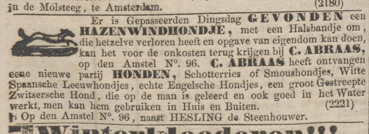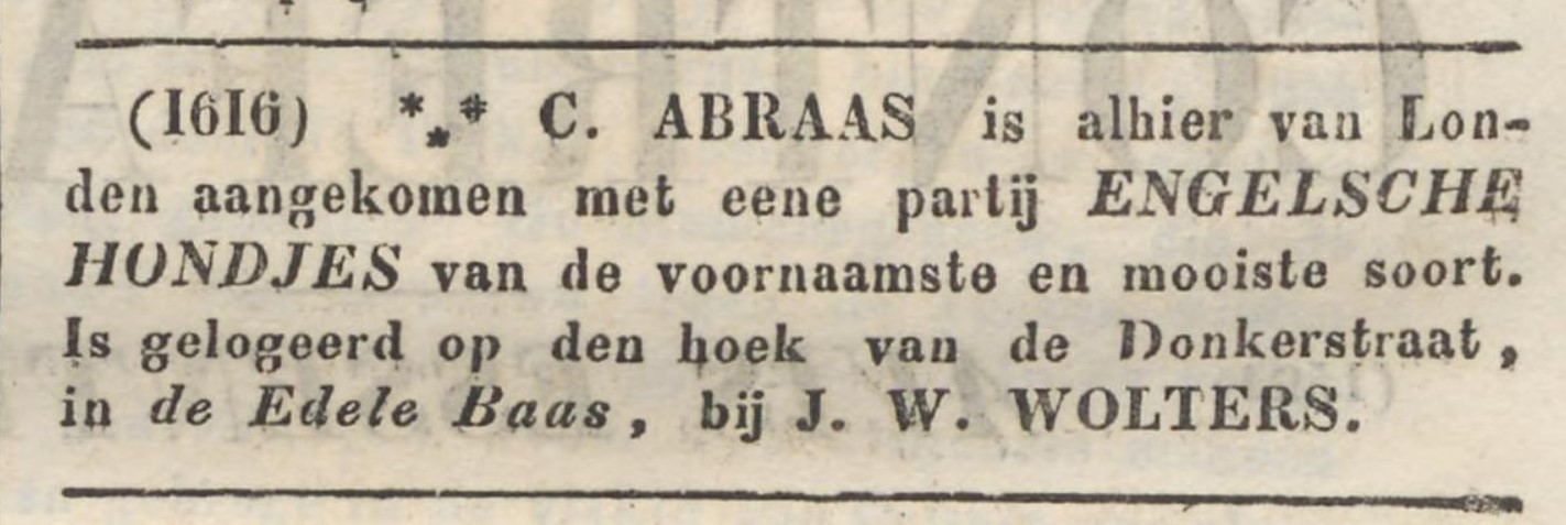 Iemand die zulke honden importeert in de jaren 1840 is Carel Abraas (1810-1886) uit Den Haag. Ooit gestart als pluimveehandelaar en poelier ziet hij meer fidusie in de hondenhandel en reist daarvoor op gezette tijden door het land om ze te verkopen. Zo legt hij aan in logement ‘De Edele Baas’ aan de Donkerstraat in Utrecht, in ‘De Gouden Klok’ bij de vleesmarkt in Rotterdam, ‘In den Bruinvisch’ aan de Koremarkt in Arnhem, ‘In den Wijnberf’ aan de Wirdumerdijk in Leeuwarden of ‘Papenborg’ aan het Winschoterdiep in Groningen. Telkens kondigt hij zijn komst aan met een grote partij ‘extra mooije Engelsche hondjes, zijnde van het echte ras’. Carel is zo vaak onderweg dat zijn echtgenote Joanna de Gast, waarmee hij in 1826 op zeventienjarige leeftijd huwde, hem zelden ziet. Ze laat zich in 1843 van hem scheiden, waarna zij en hij beiden opnieuw in het huwelijk treden met een ander. Hij met de Engelse Johanna Maria Henrietta Richard. Ze gaan in Amsterdam aan de Wagenstraat, tussen de Amstel en de Amstelstraat, wonen.