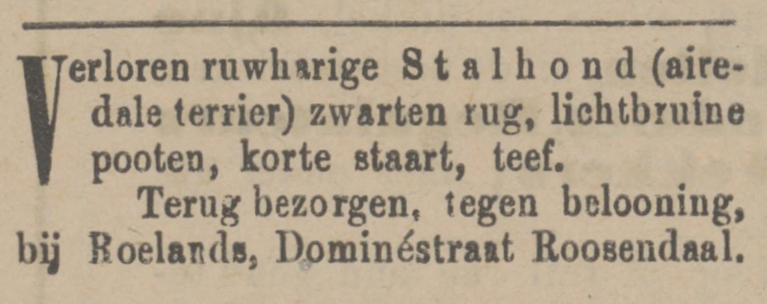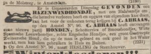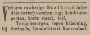 “Een geel Stalsmous, reu, 14 md. ond, besten rattenvanger, gewend met rijtuig mede te loopen”, biedt een anonieme Rotterdammer -brieven onder letter ‘L’ bij een boekhandelaar- een hondje aan dat in het plaatje past.