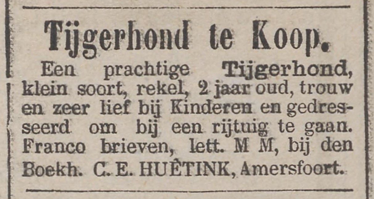 Naast Deense doggen zijn grote honden met stippels populair. “Daer is op Woensdag den 5 May verlooren een jonge Tygerhond, swart en wel getekent, zynde een Reu. Die hem aengehouden heeft hem te brengen aen het huys van de Hr. Aldewereld, op de Heere-gracht, by de Heere-straet, sal 2 Ducatons tot een vereering genieten”, aldus de oproep in de Amsterdamse Courant van 11 mei 1700. Op de Amsterdamse grachten maken in de achttiende eeuw ‘tygerhonden’, wit met zwarte stippels, hun entree als modehond naast de koets. Tijger wil niet zeggen gestreept, zoals we tegenwoordig naar een echte tijger kijken, maar eerder gestippeld als een tijgerbol of tijgernootjes; in de 18e eeuw zag men ook een gestippelde panter of luipaard voor ‘tijger’ aan. Nu spreken we over Dalmatische honden.