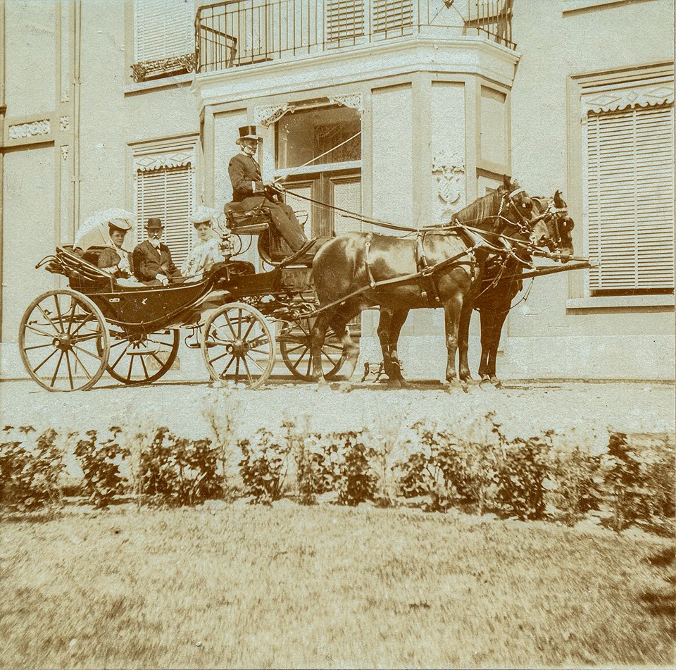 Voor de deur van Villa Geldersch Hof, het huis van de familie Bahlmann aan de Postweg in Groesbeek. In de barouche, in het wit Josefa Diepen-Sträter, met parasol Anna Sträter en Willem Bahlmann. In de negentiende eeuw kwam de heuvelachtige bosrijke omgeving aan de oostzijde van Nijmegen in zwang als woonplaats voor de elite. Zeepfabrikant [...]